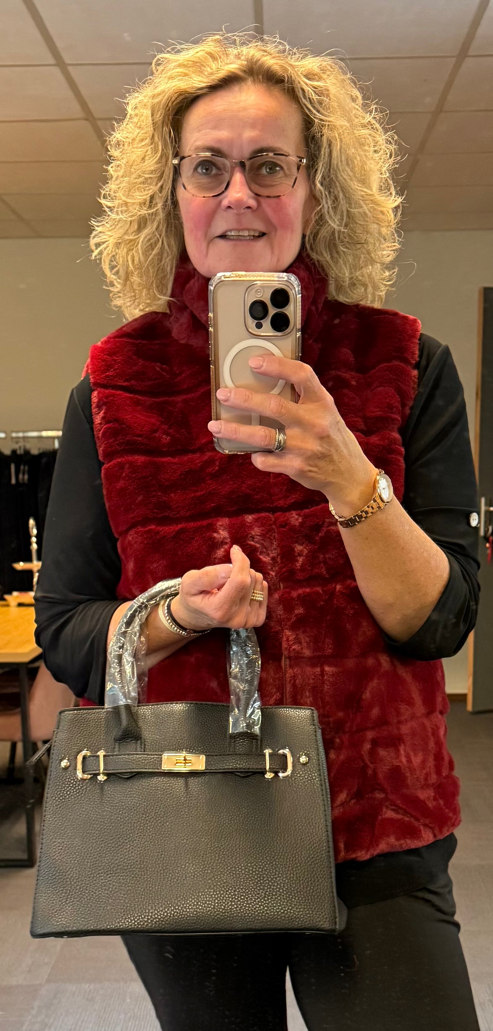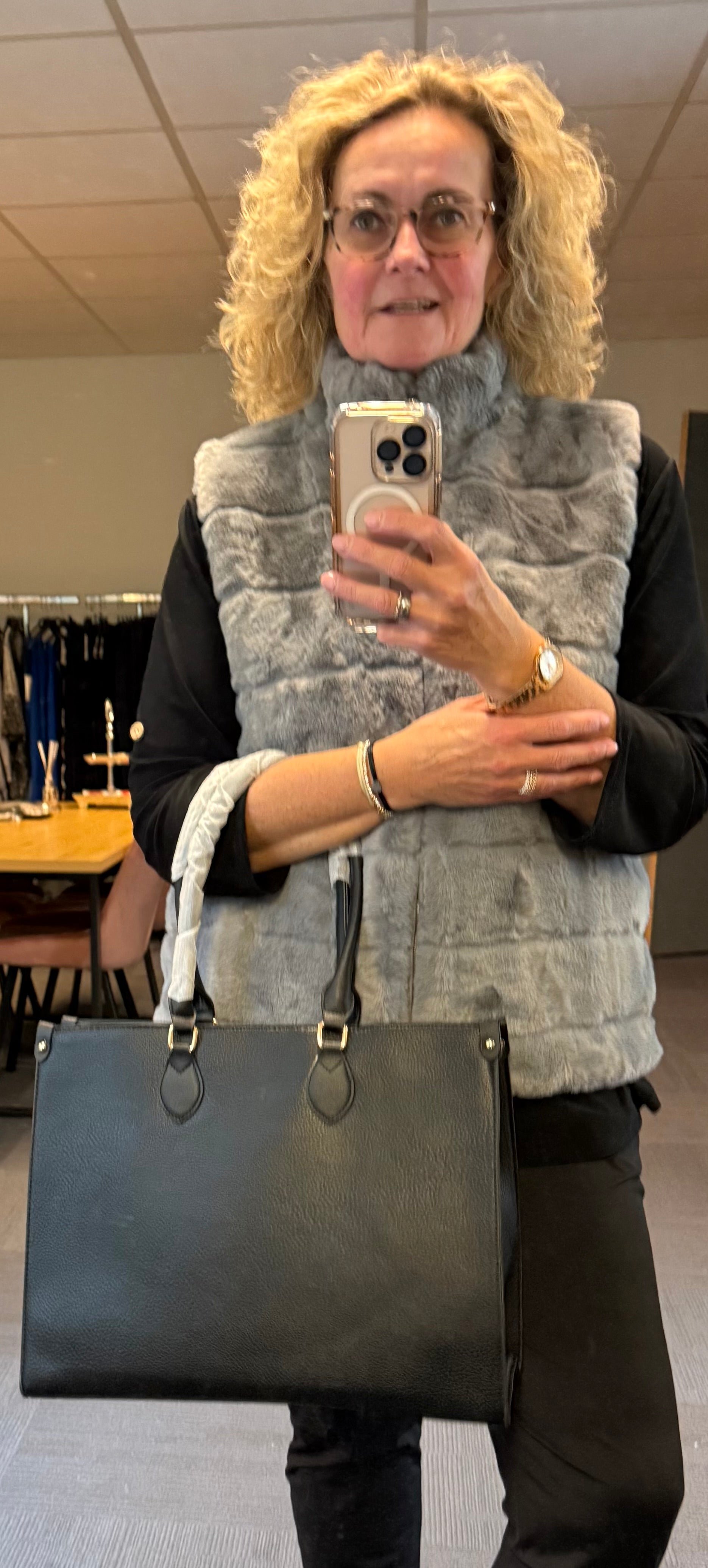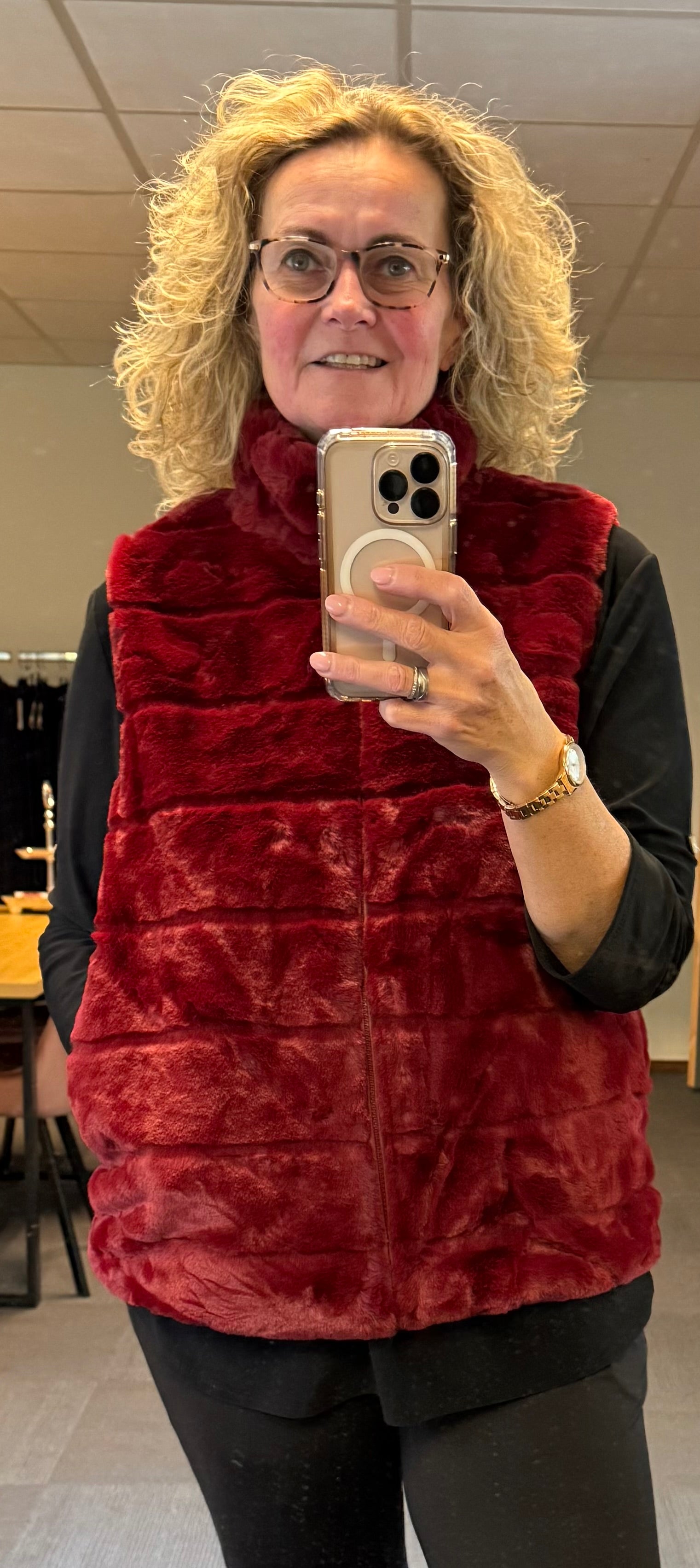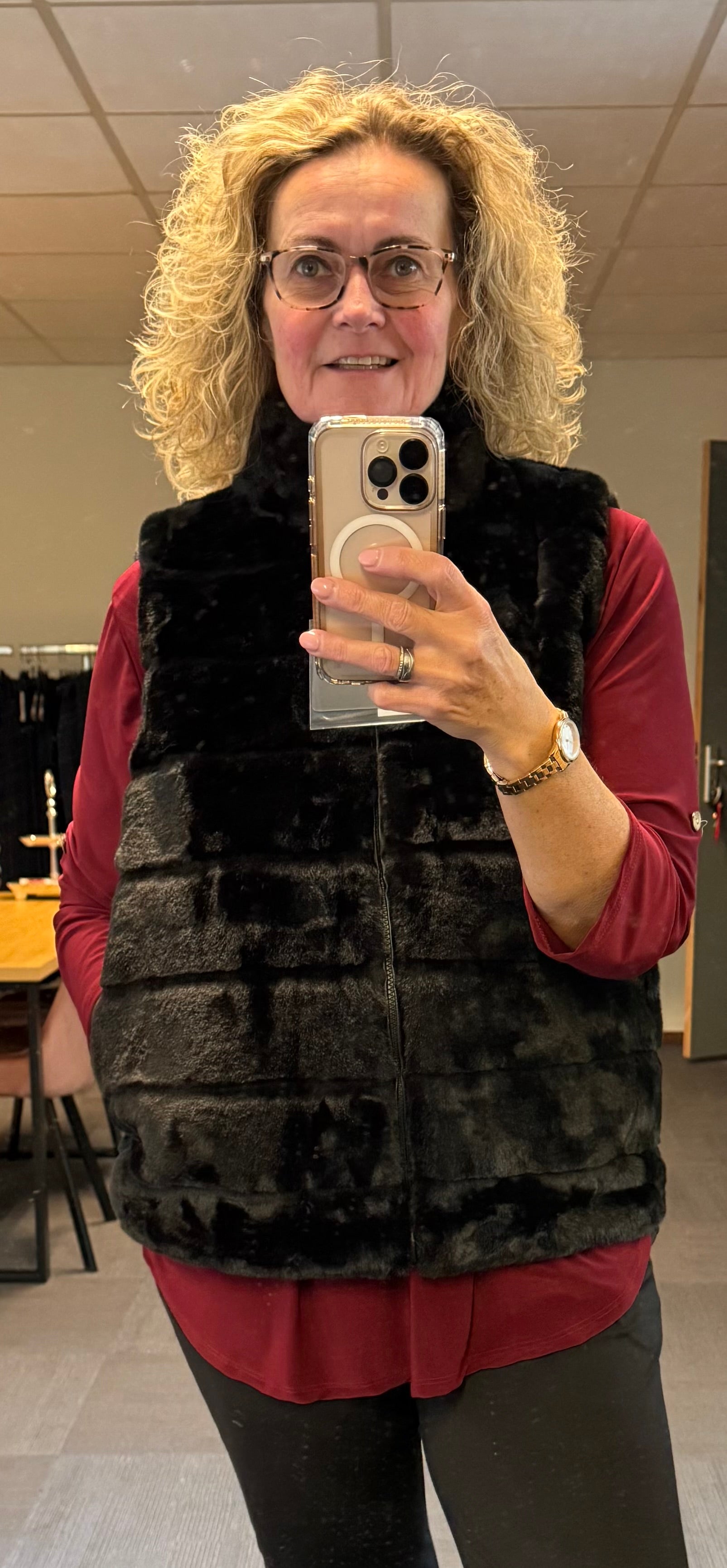 Helemaal trendy deze bodywarmer in nep bont.