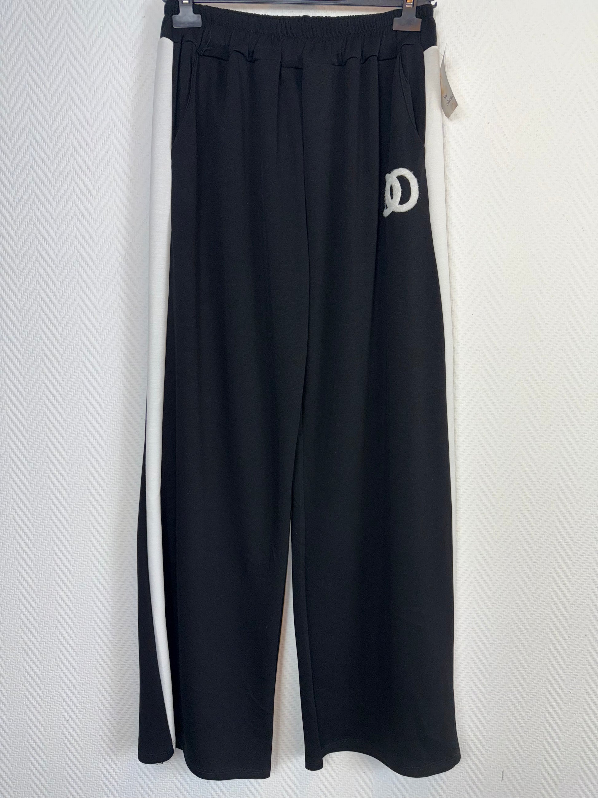 De broek is uiteraard een hoog model, met elastische taille, 2 steekzakken en recht/wijde pijpen.