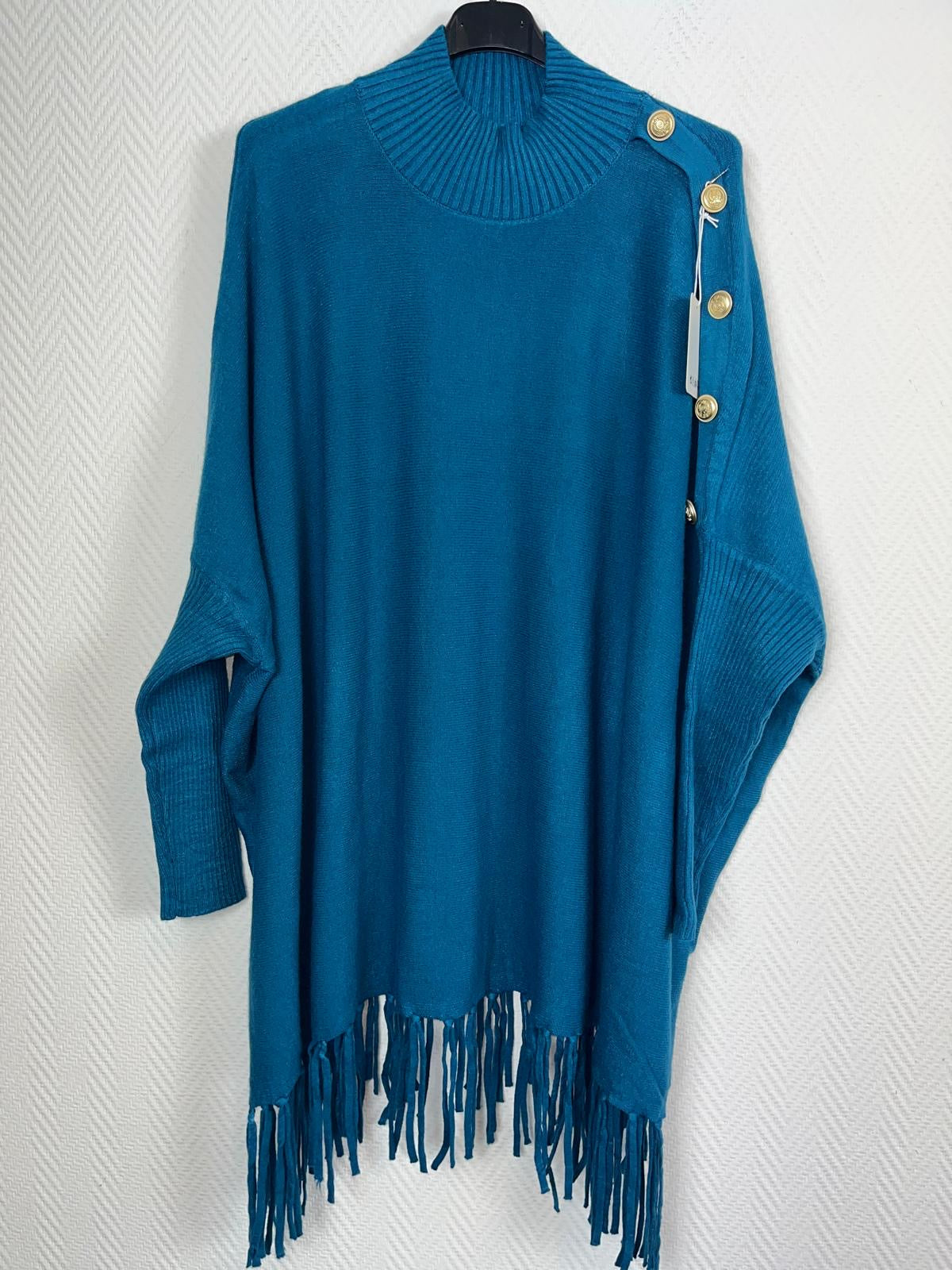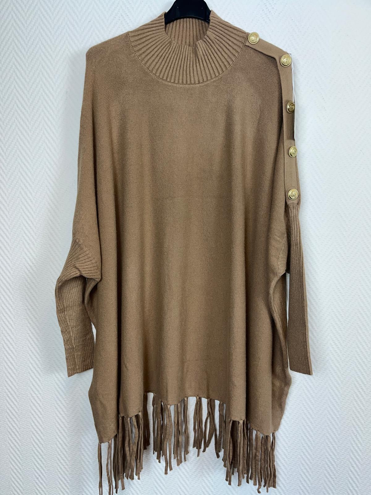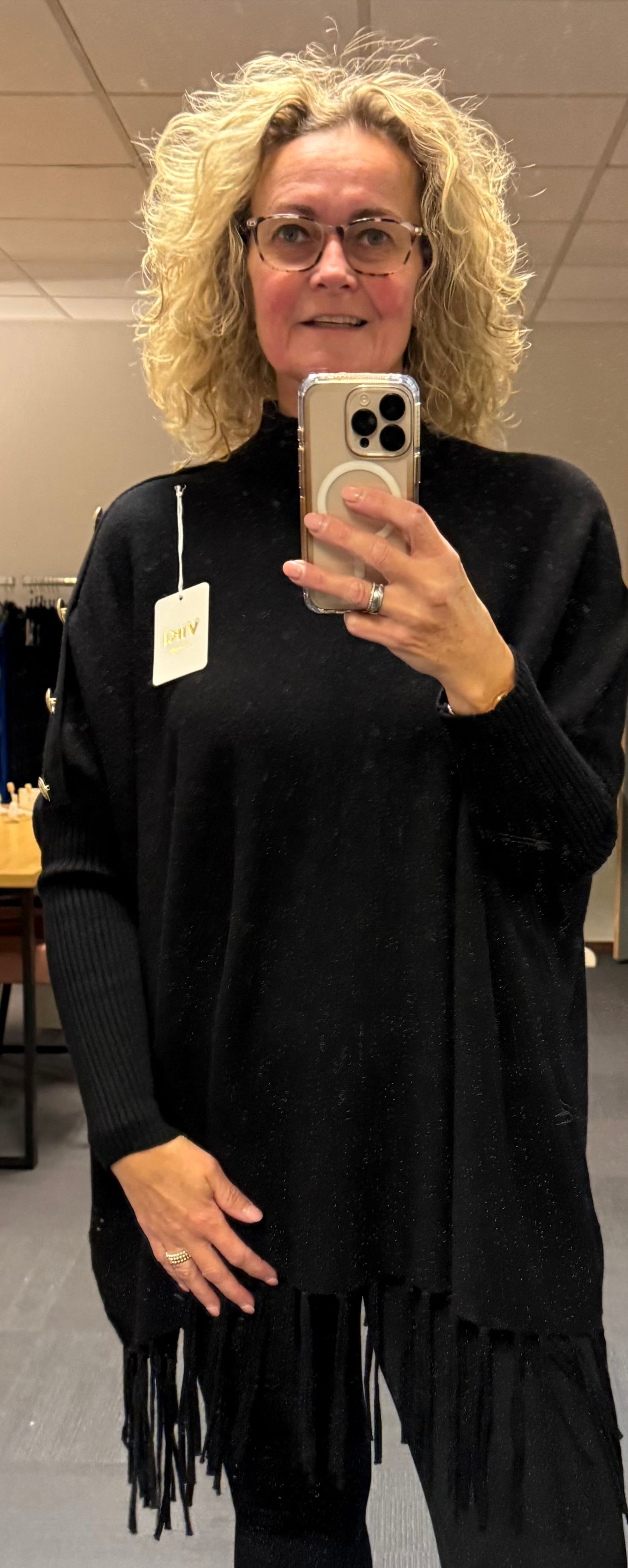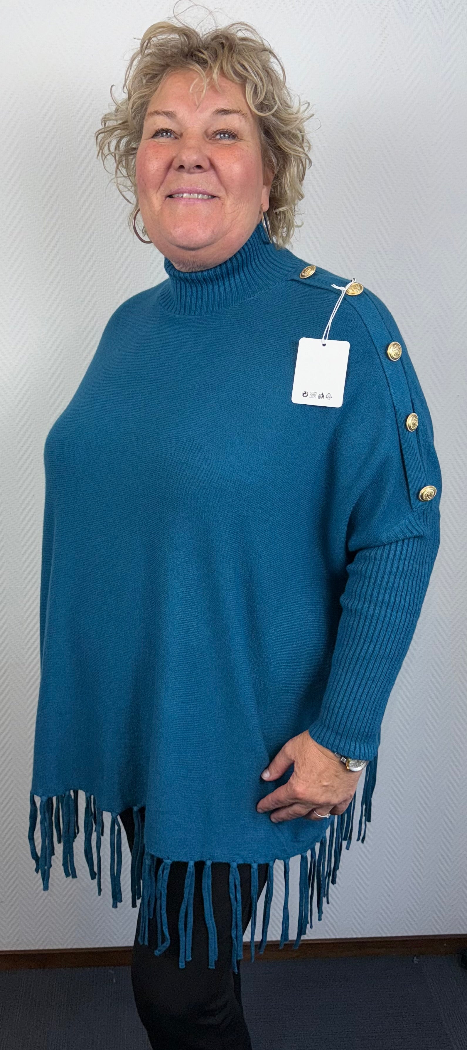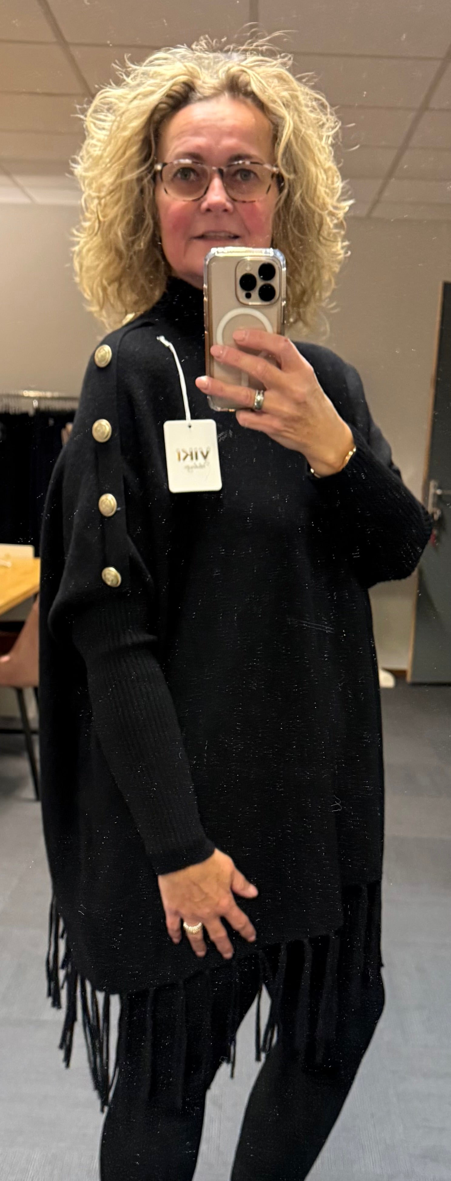 Leuke knopen op de linker schouder en dan die franjes onderop 👌