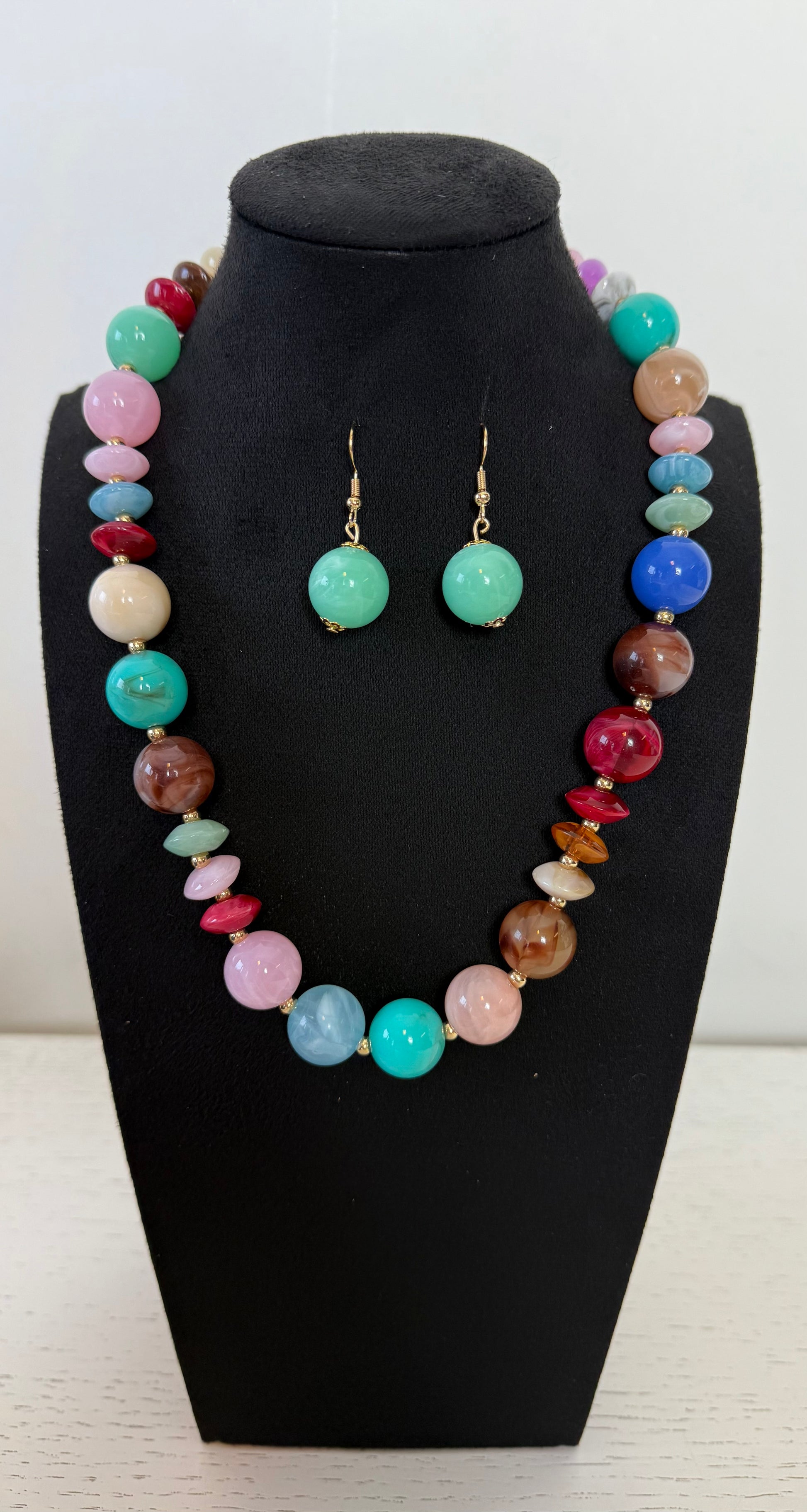 De set bestaat uit een ketting in meerdere kleurtjes en daarbij een paar mintgroene oorbellen.