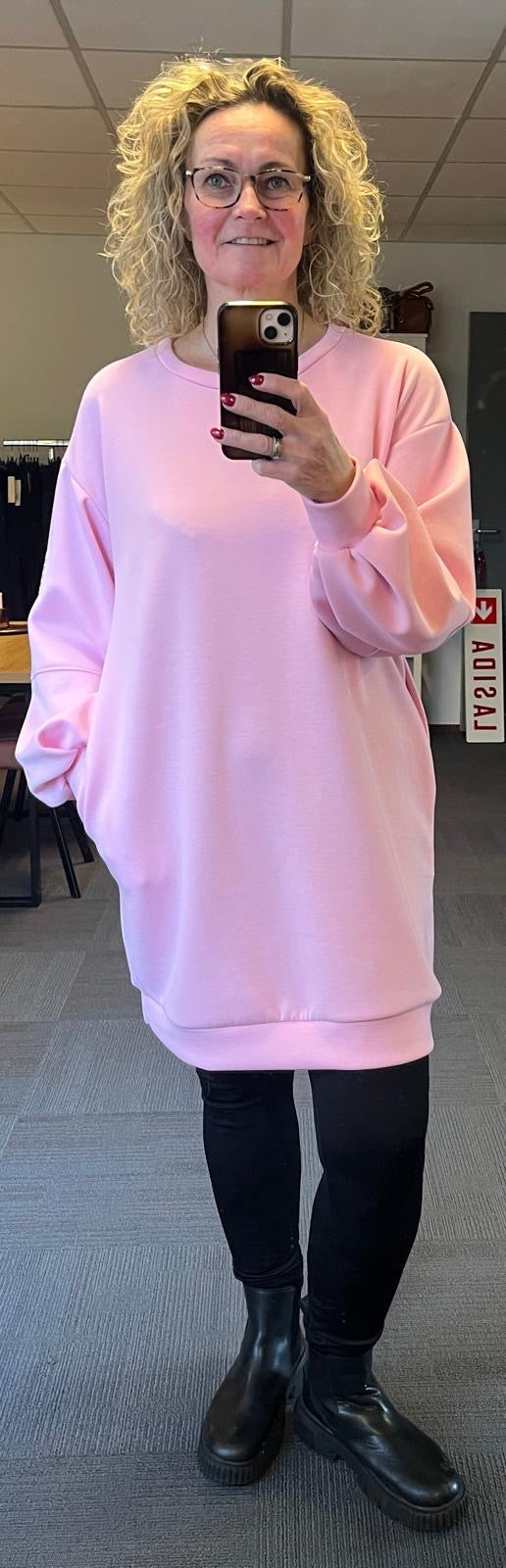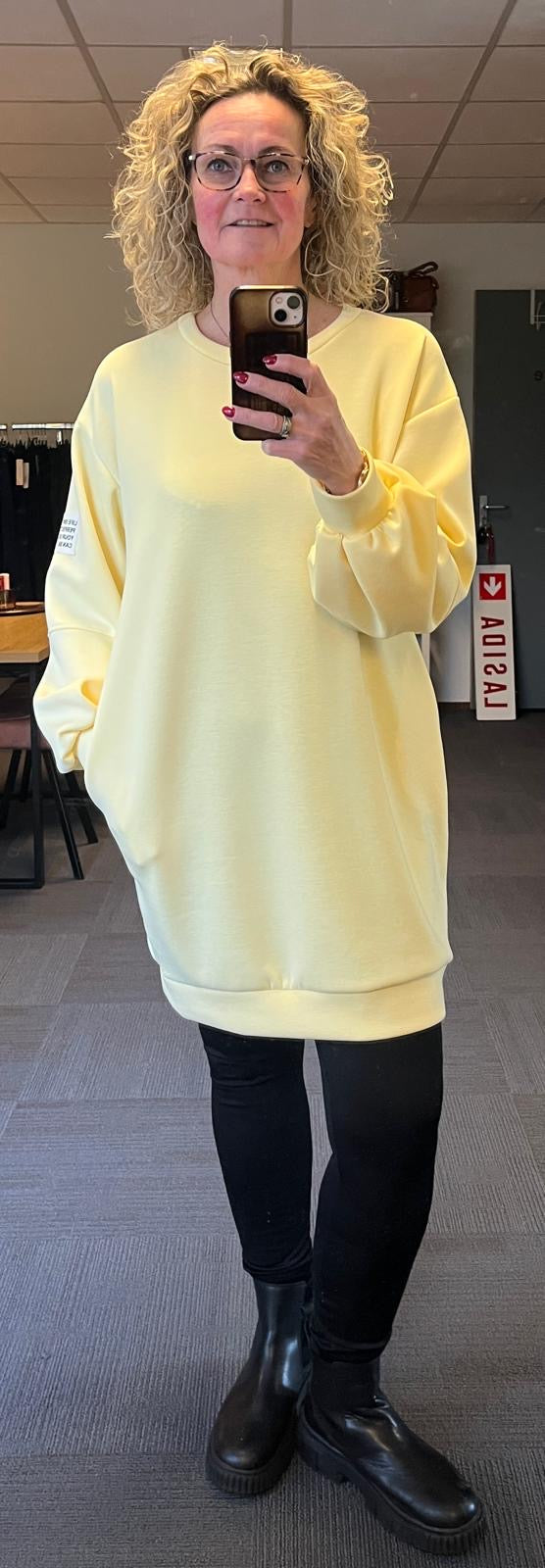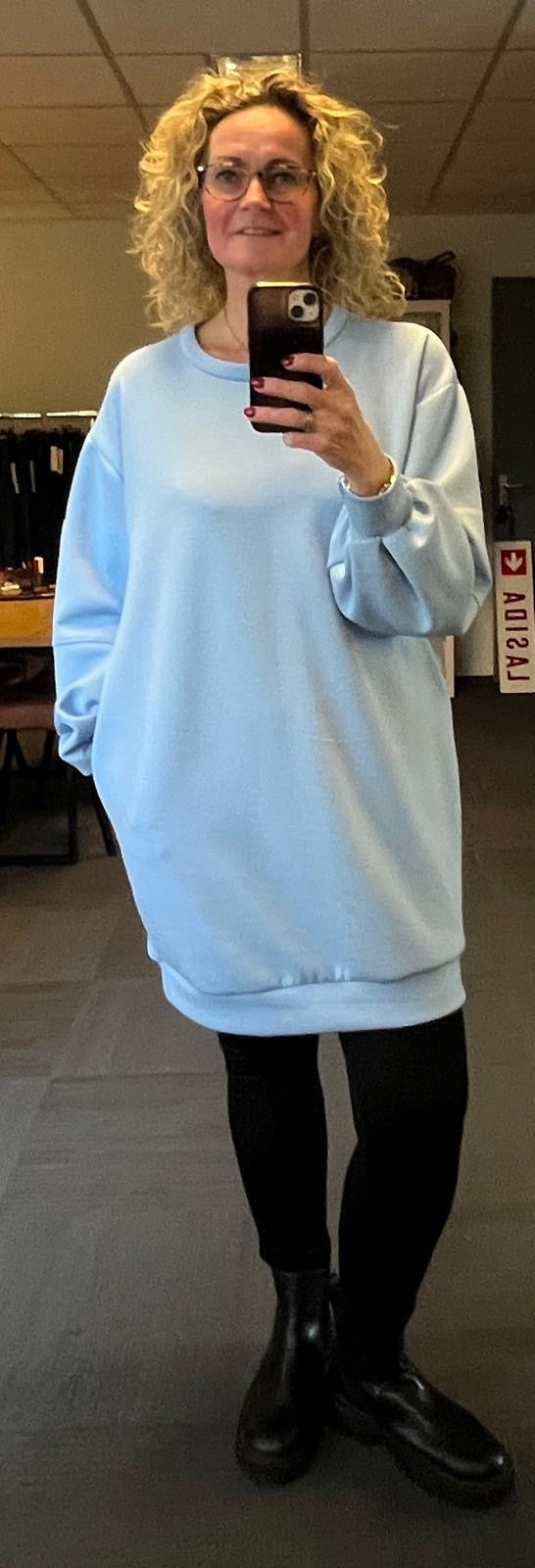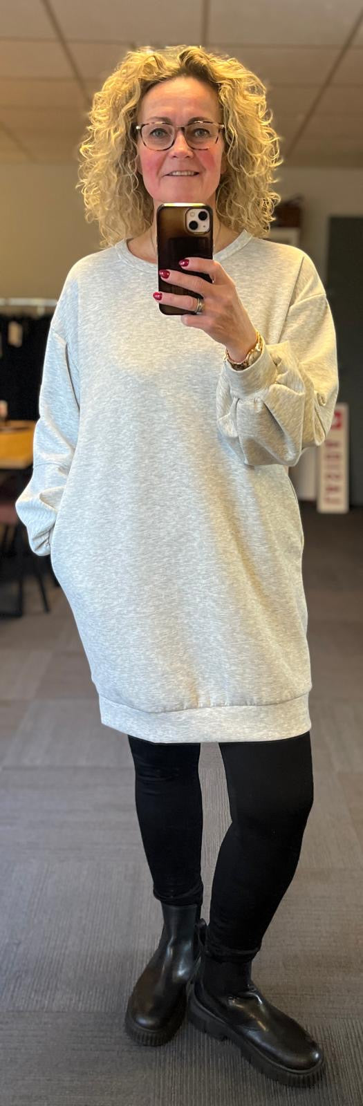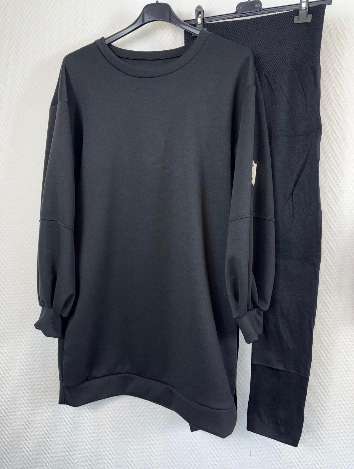 Set bestaat uit een sweatdress met label op de mouw waarop staat: Life is not perfect but your outfit can be en daarbij die super fijne licht gevoerde legging in zwart.