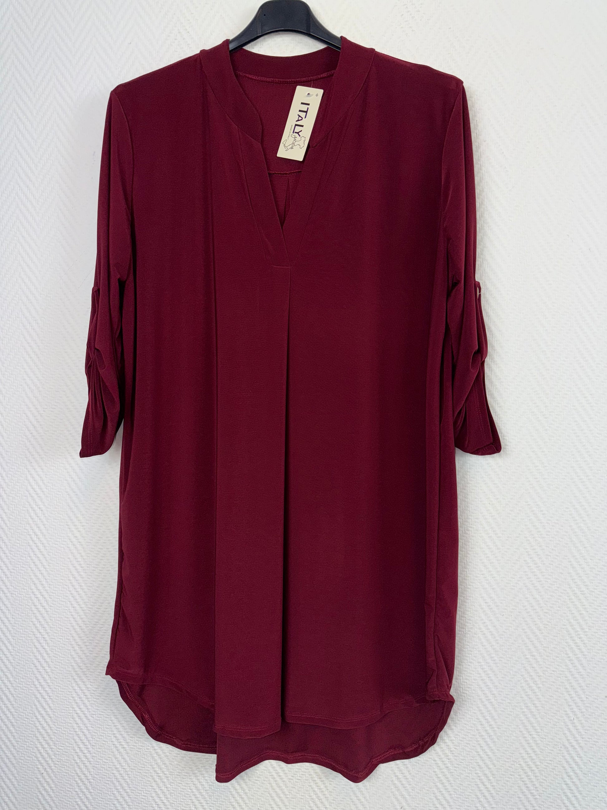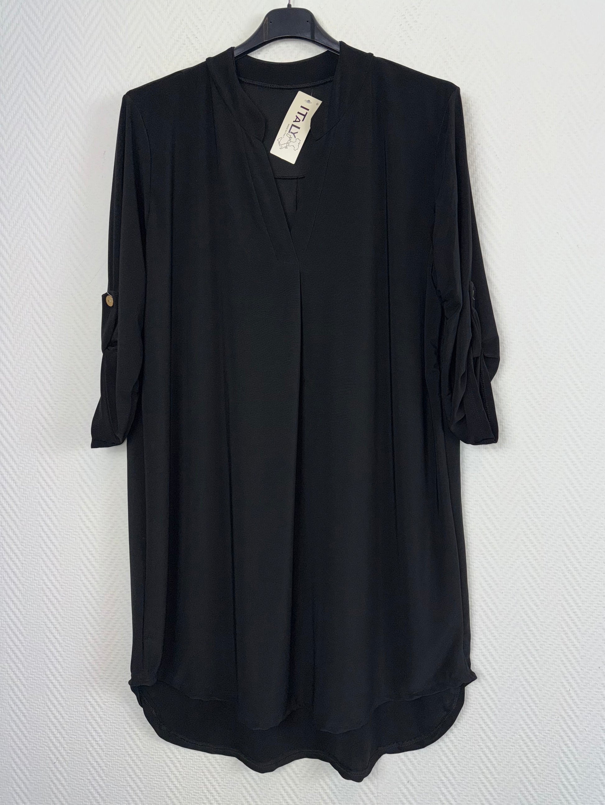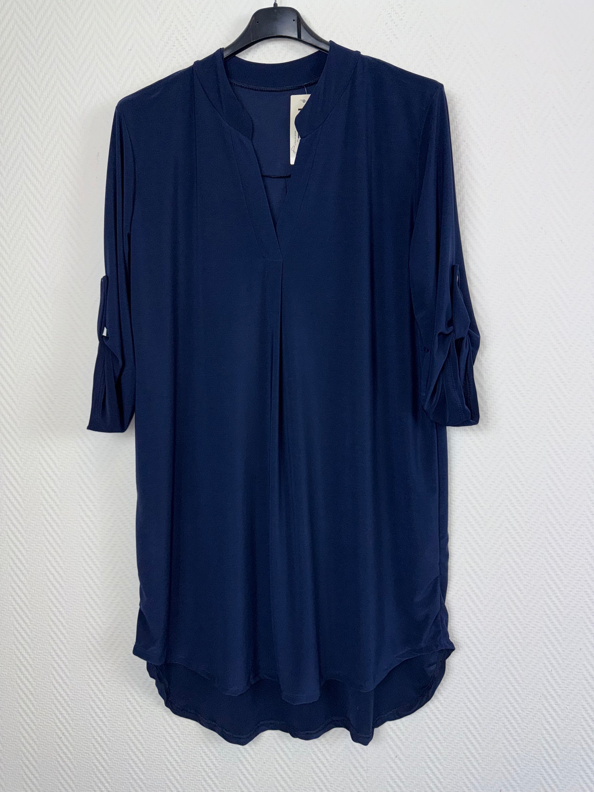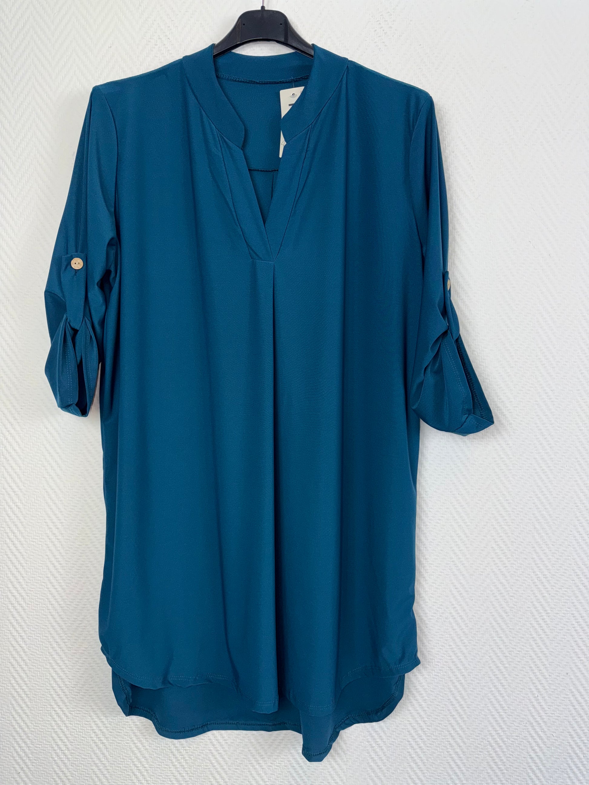 Lang tuniek in dat fijne travelstof met een V hals en ophaal mouwen mouwen