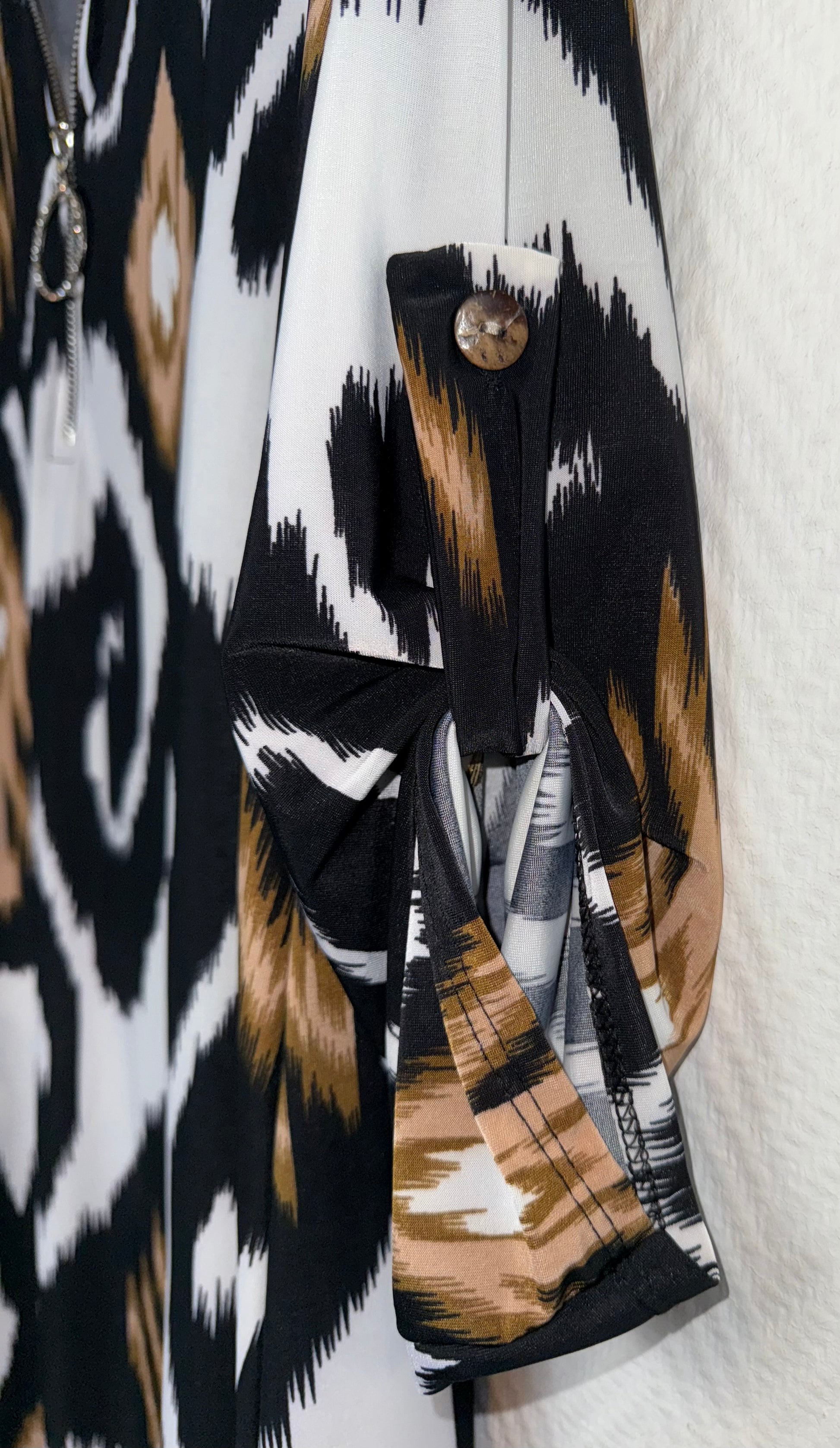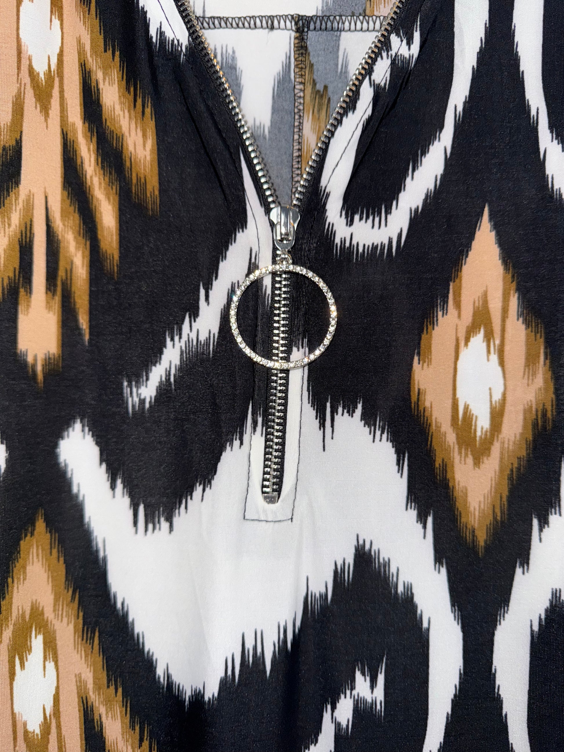 Super leuk A lijn tuniek/jurkje in dat fijne travelstof met V hals, ophaal mouwen en rits dus je kunt zelf bepalen hoe laag of hoog je de V doet.