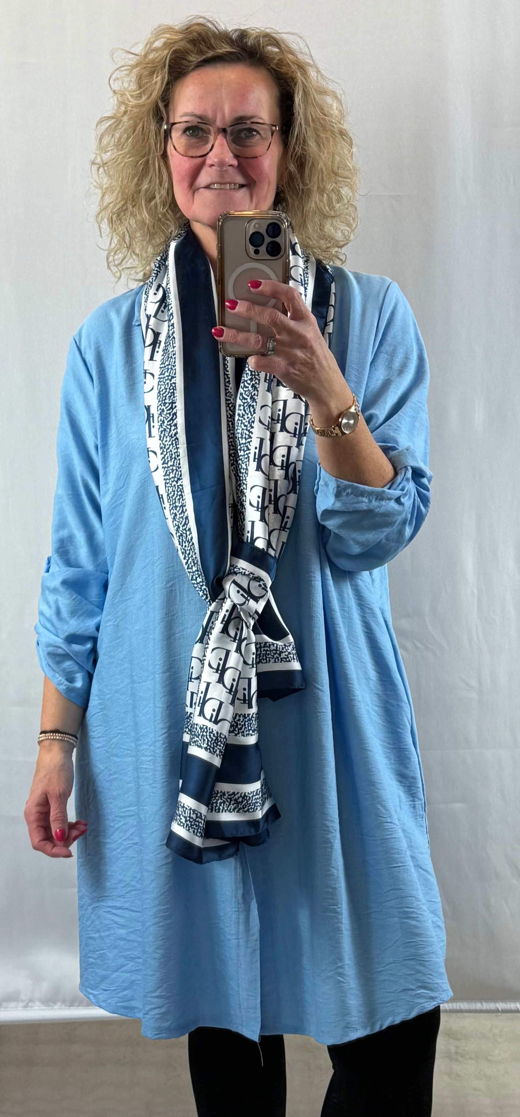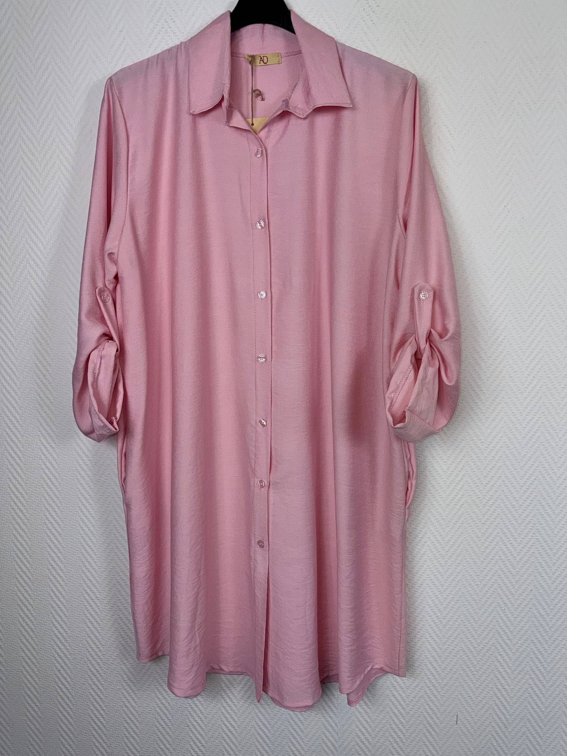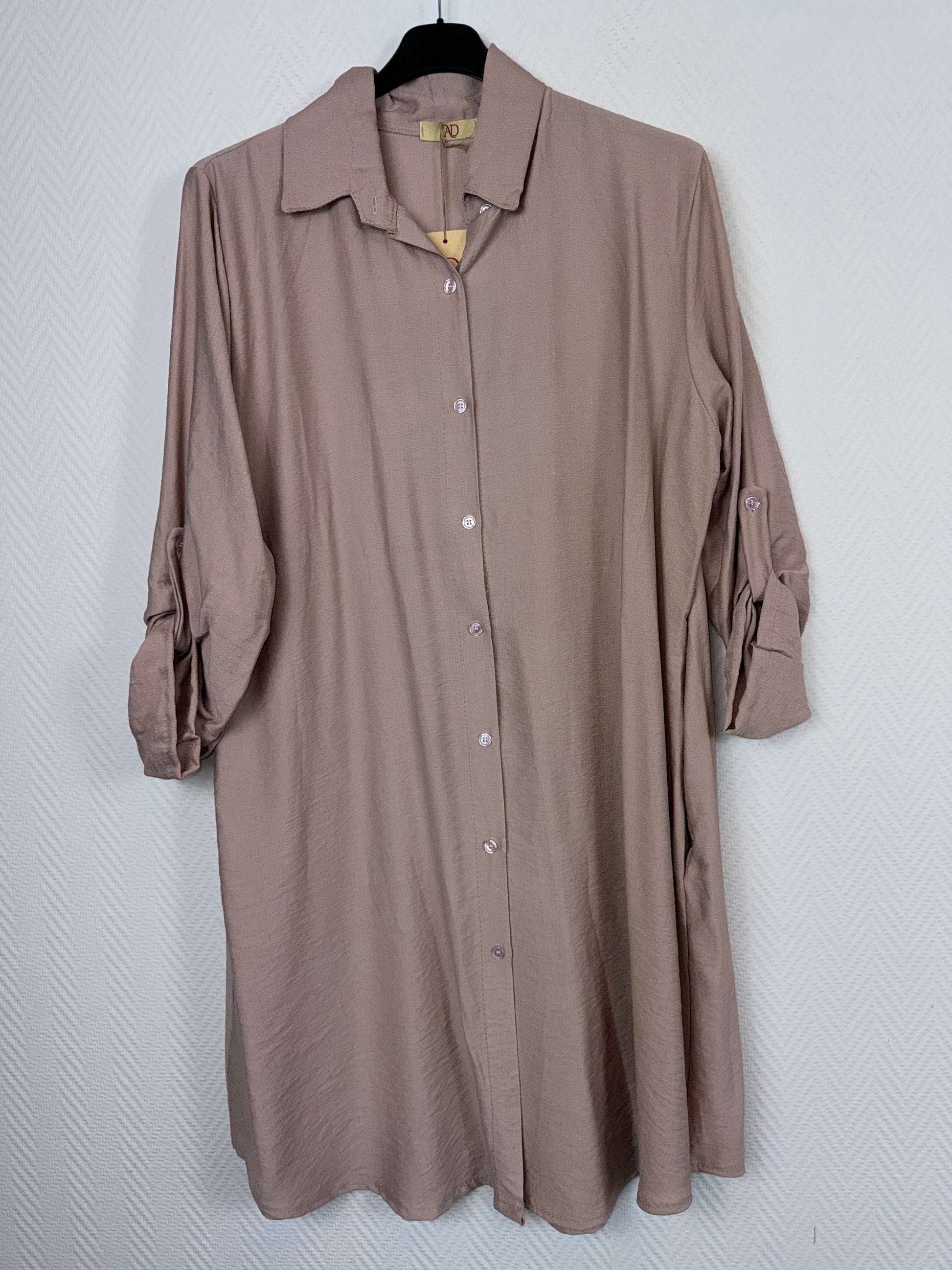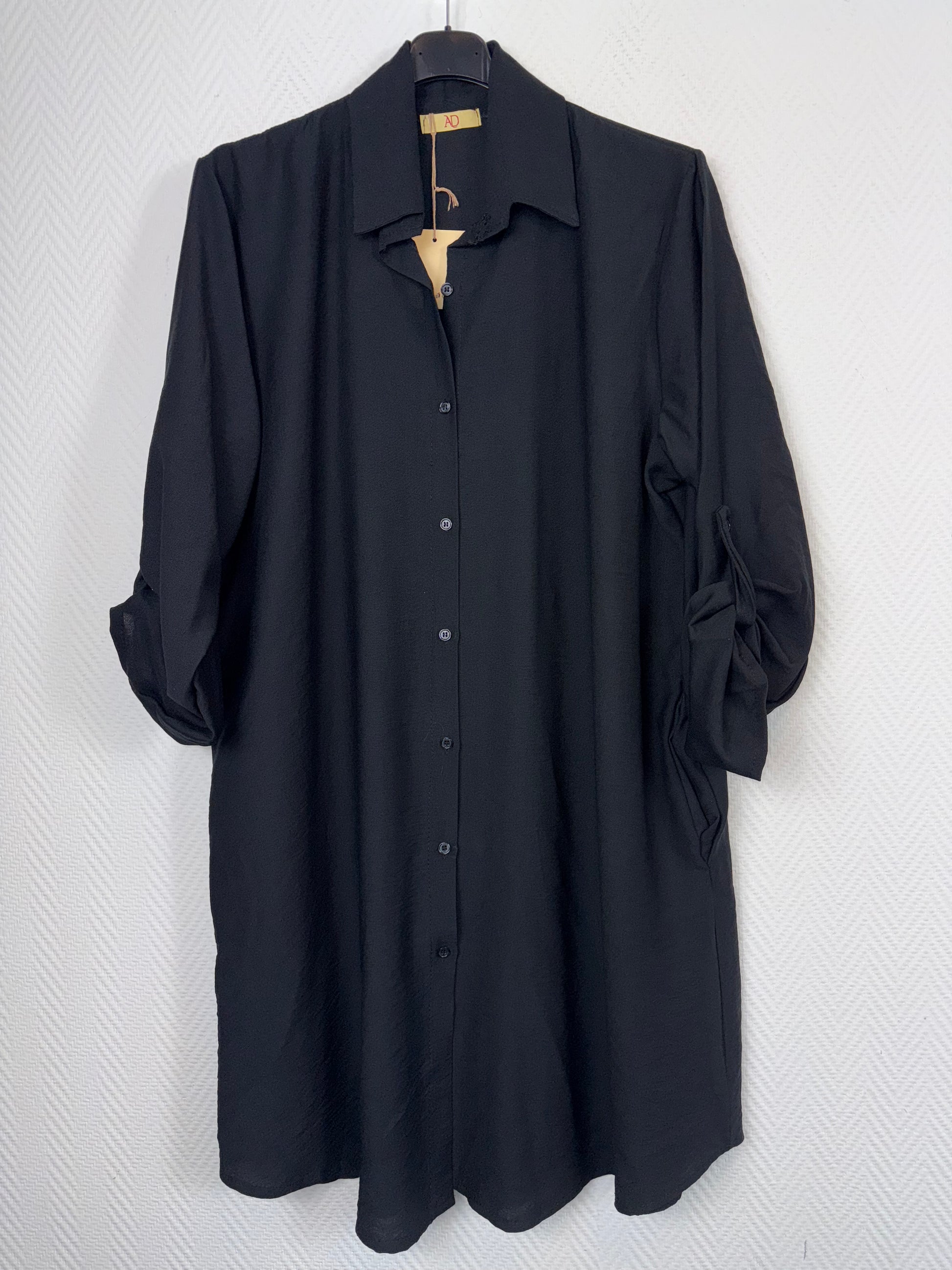 Lange blouse/tuniek/jurk met ophaalmouwen en zakken.