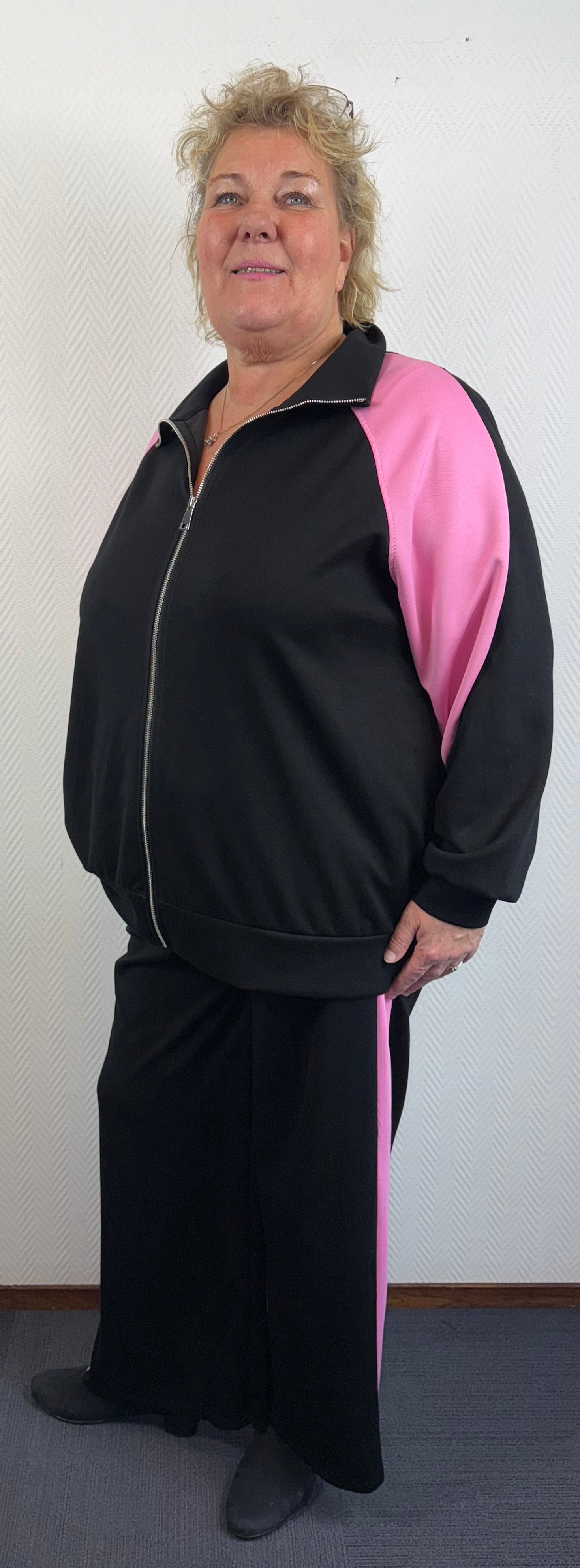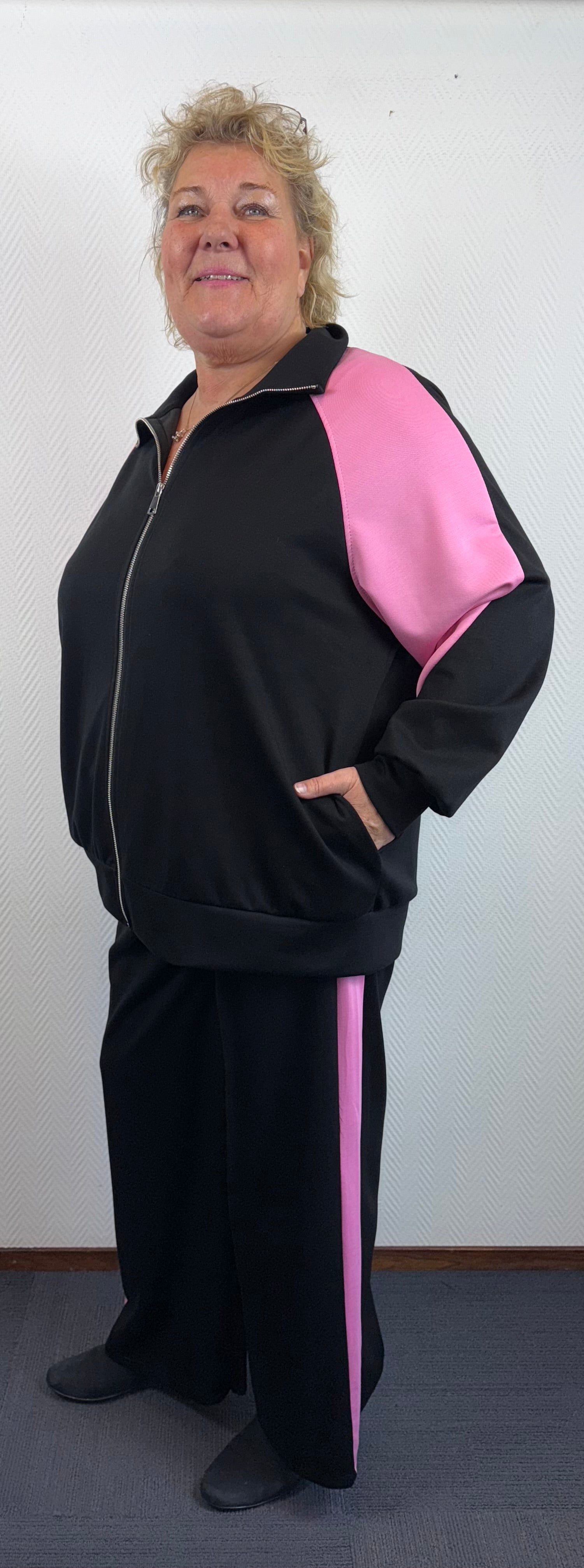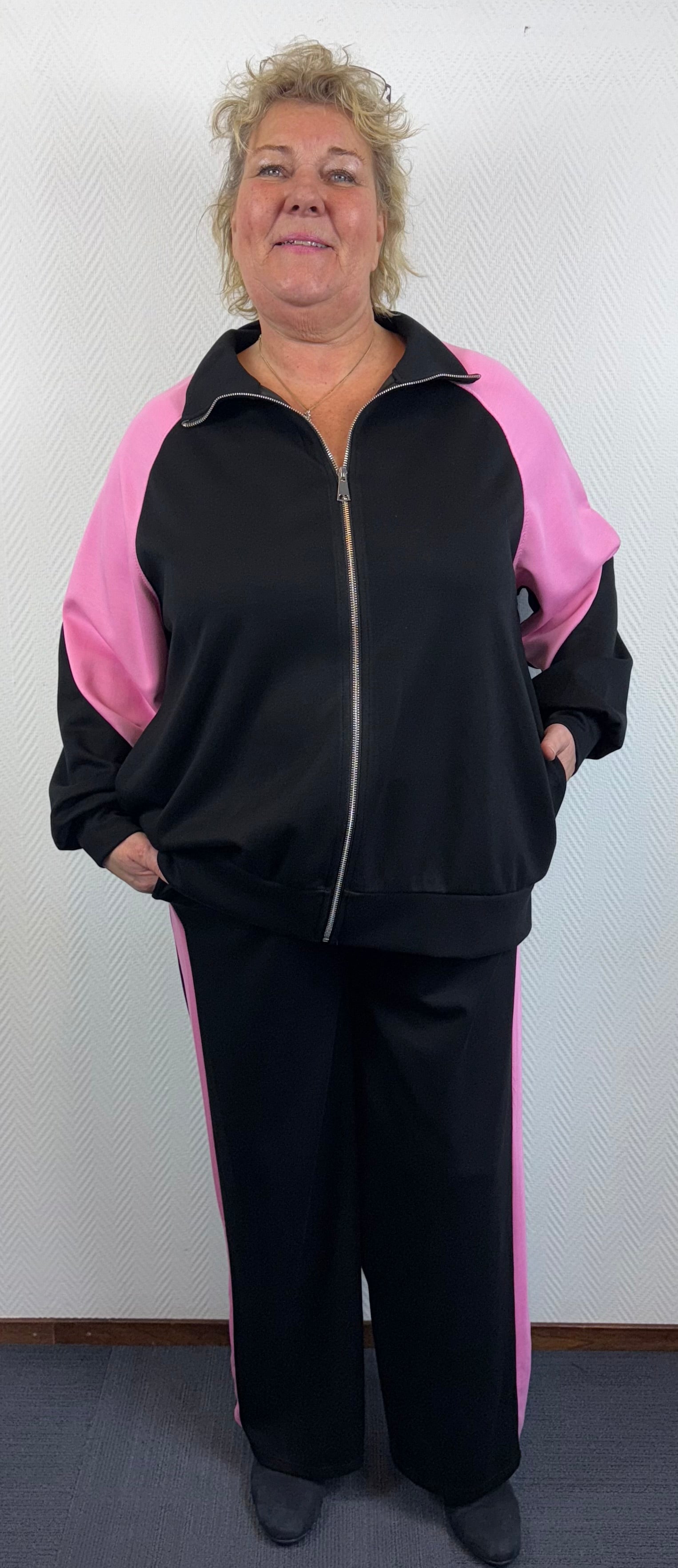 Heerlijk comfy pak die bestaat uit een jasje met rits en zakken en daarbij een broek met elastische taille in hoog model en met recht/wijde pijpen.