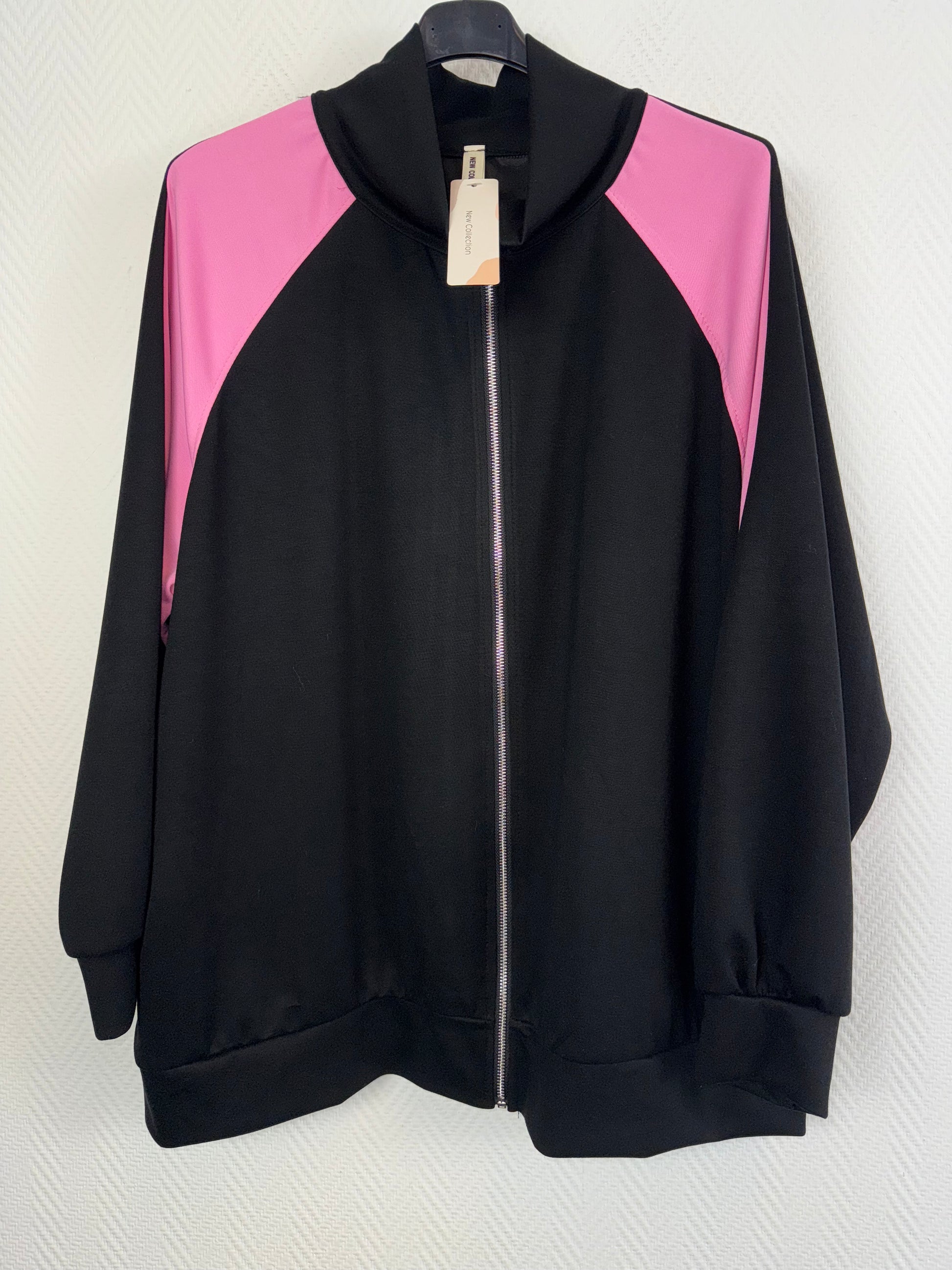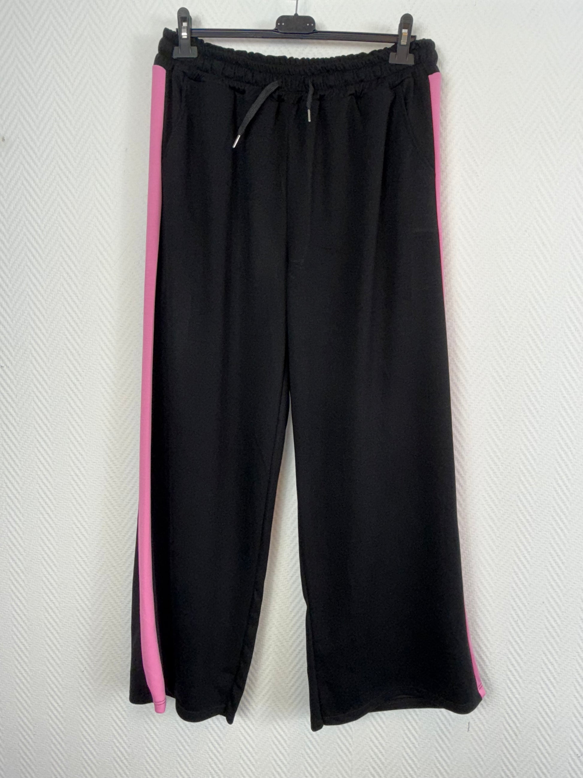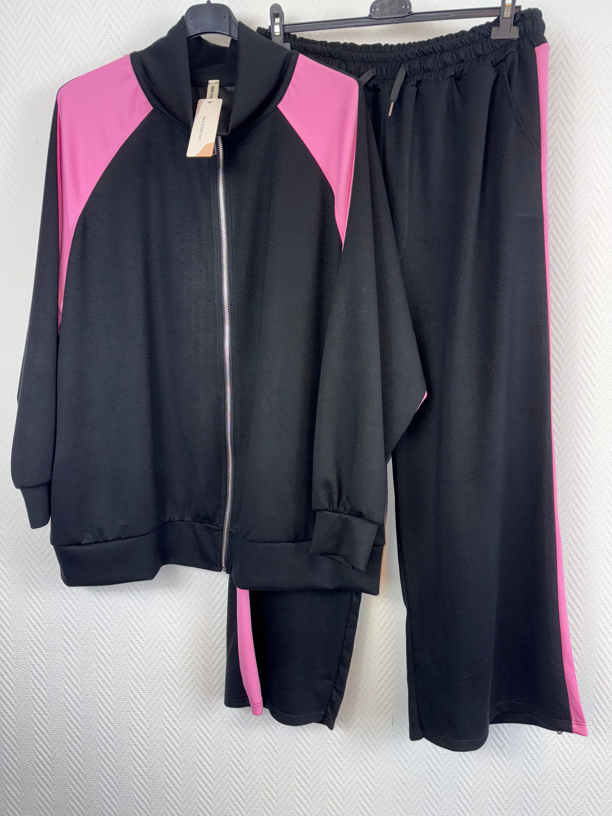Heerlijk comfy pak die bestaat uit een jasje met rits en zakken en daarbij een broek met elastische taille in hoog model en met recht/wijde pijpen.
