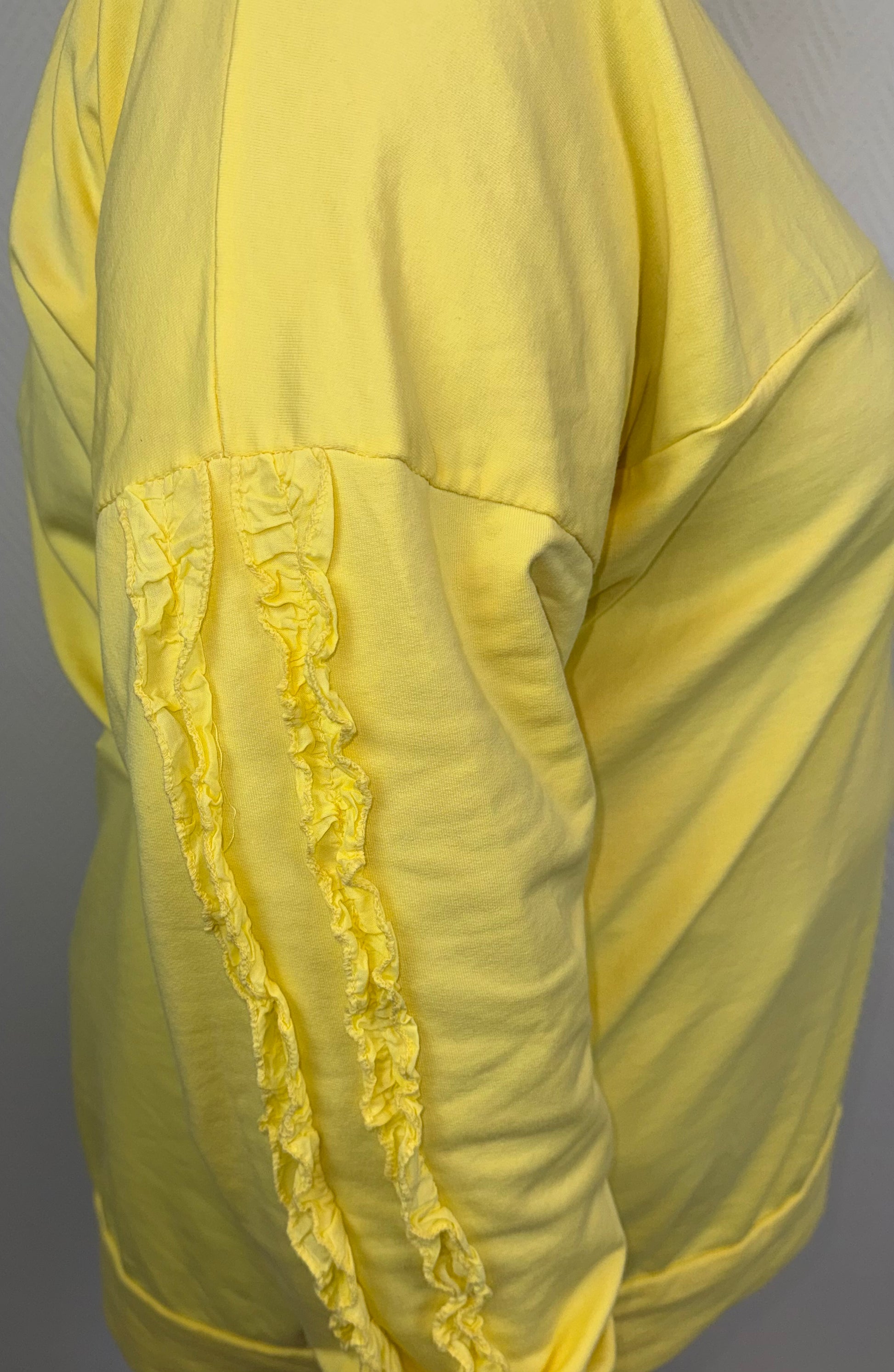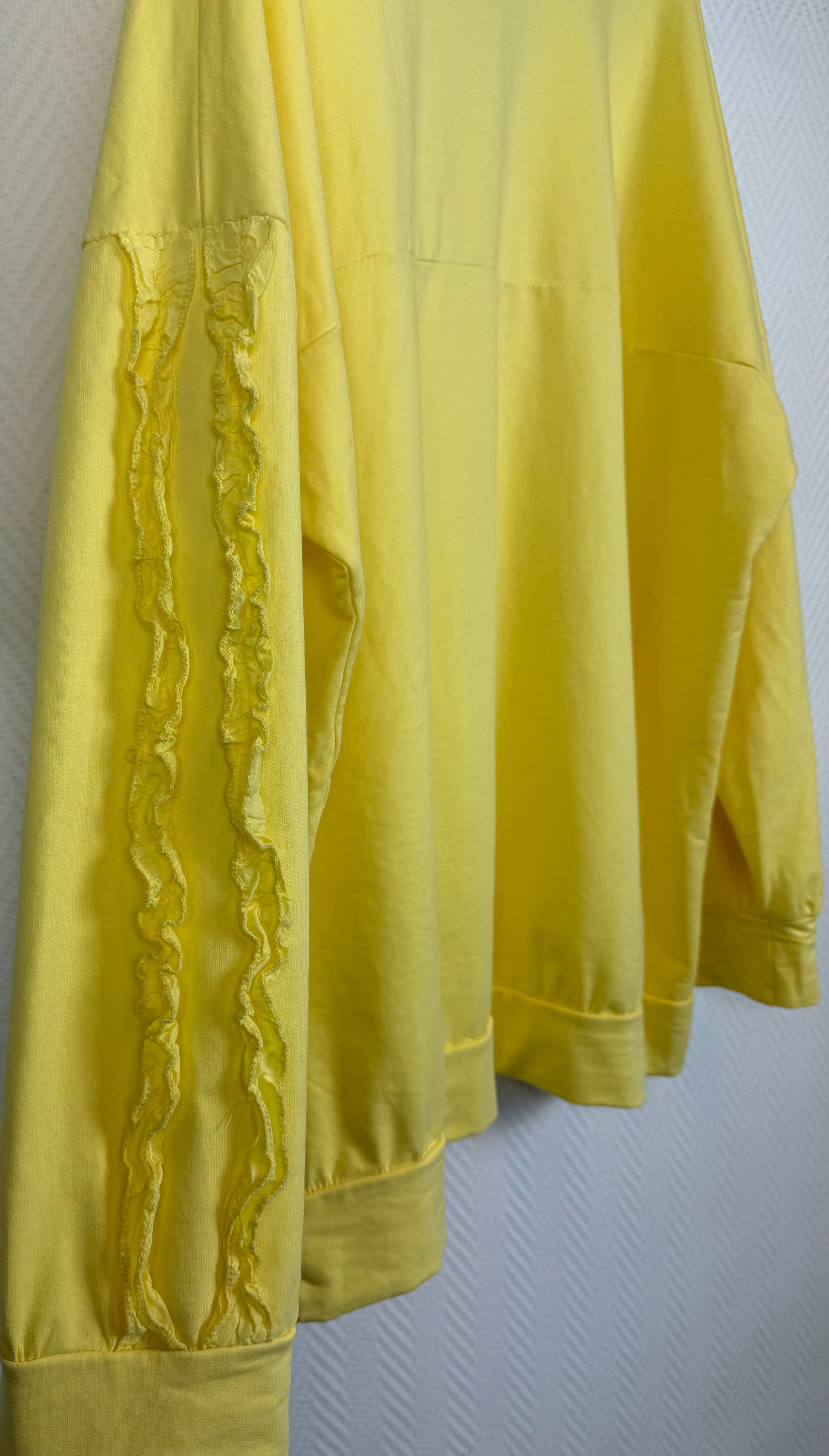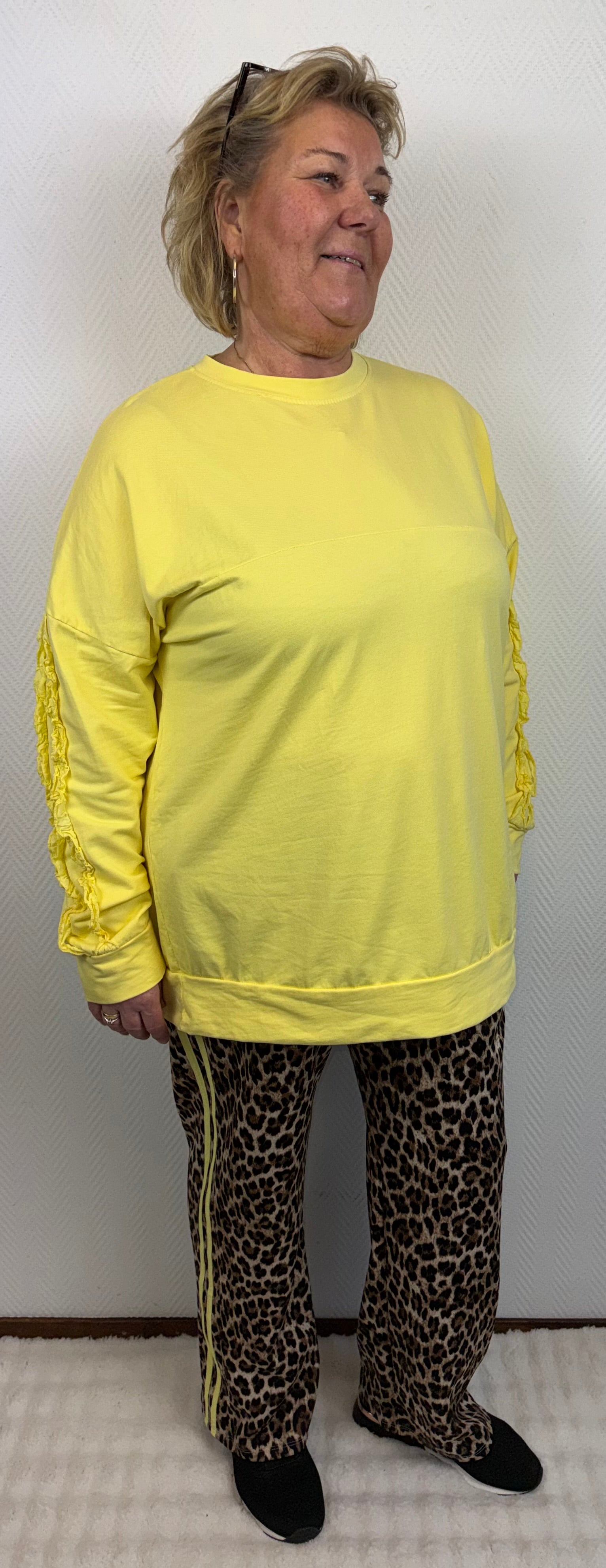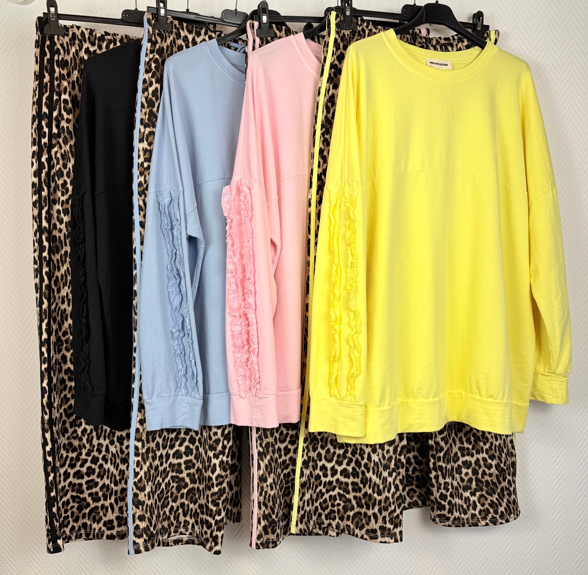 De broek is een luxere kwaliteit en dan voel je aan de stof want de stof behoudt prachtig zijn kleuren ook als het uitgerekt wordt en aan de zijkanten dat leuke, trendy dubbele streepje in de kleuren van de truien.