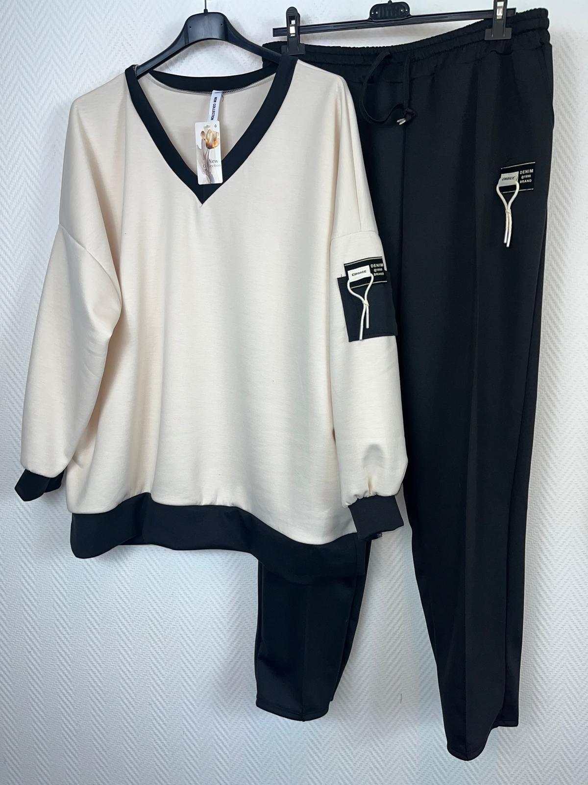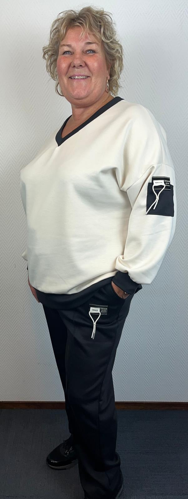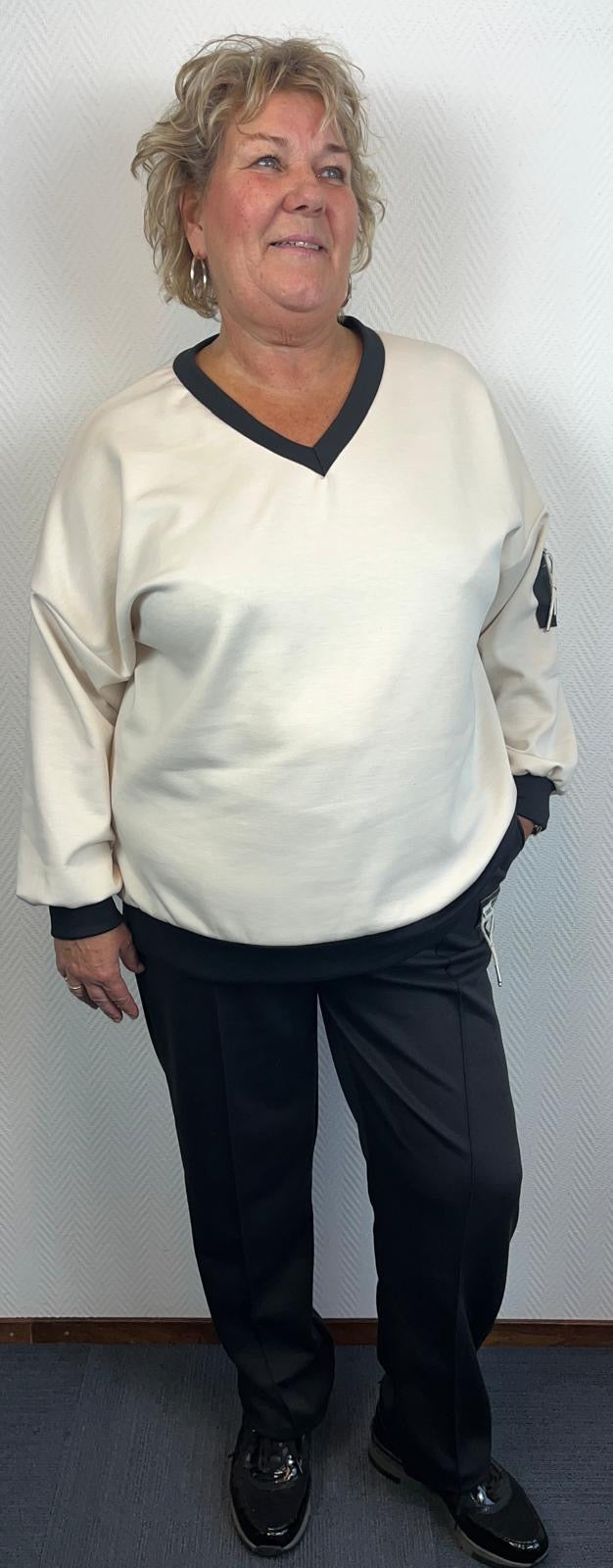 Trui heeft een V hals en leuke details op de mouwen en de broek is een hoog model met elastische taille en recht wijde pijpen en hetzelfde leuke detail komt terug op re broek.