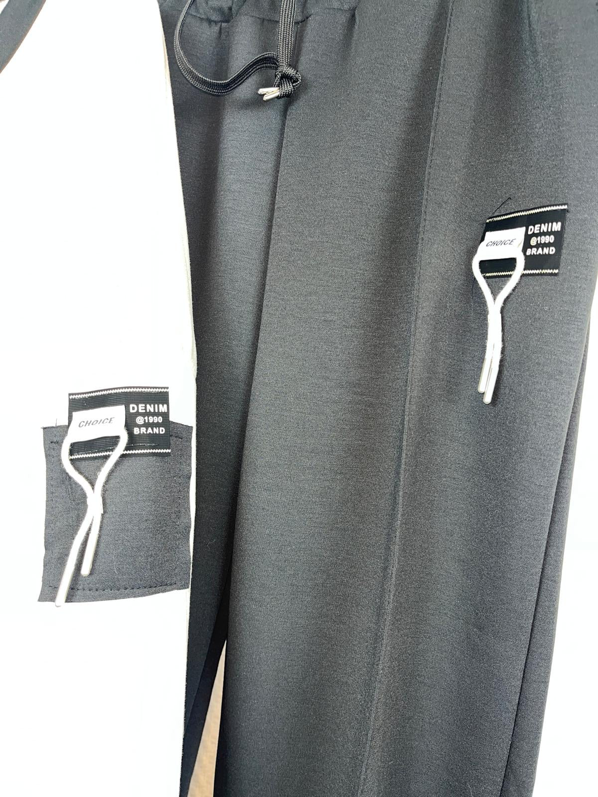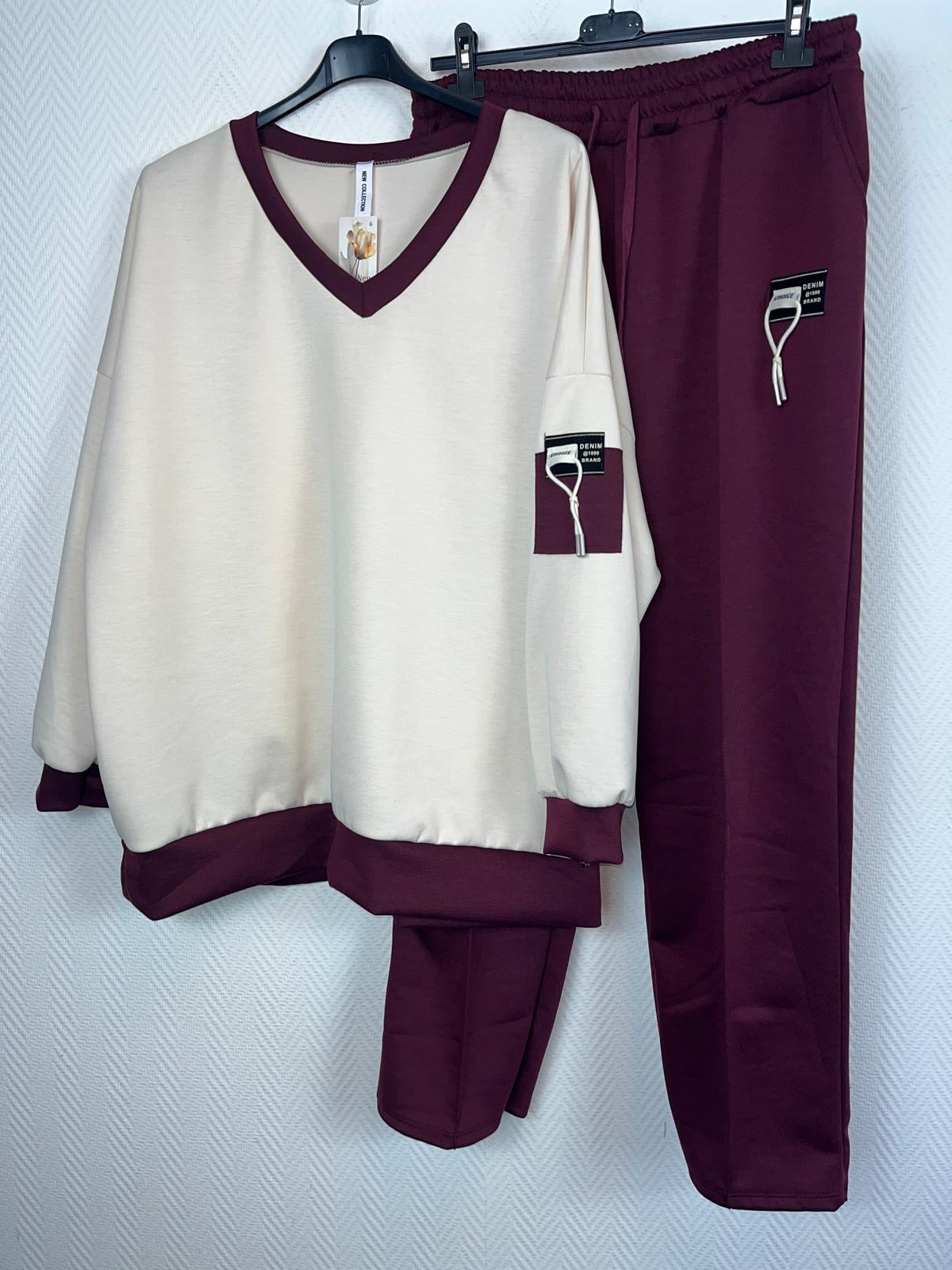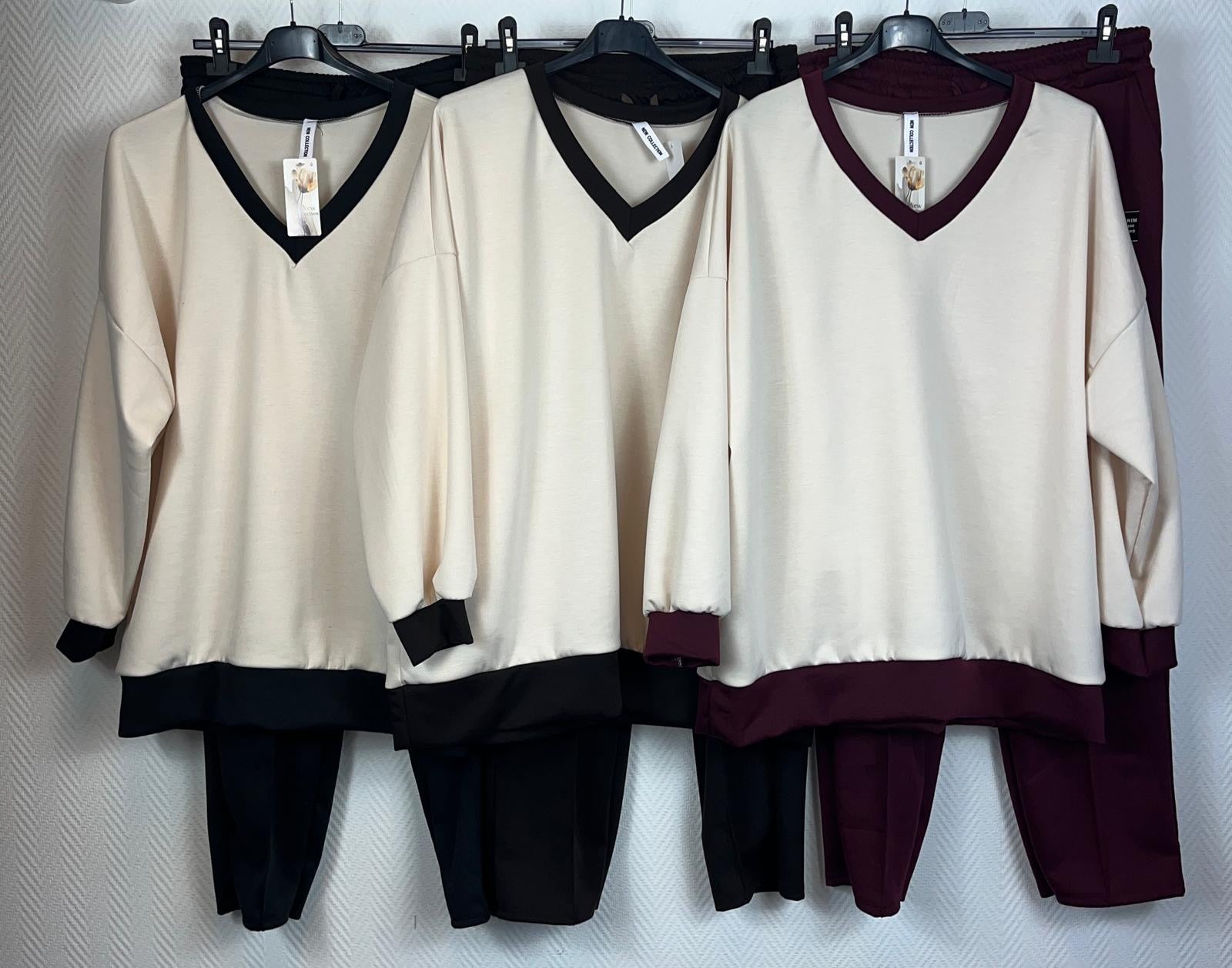 Trui heeft een V hals en leuke details op de mouwen en de broek is een hoog model met elastische taille en recht wijde pijpen en hetzelfde leuke detail komt terug op re broek.