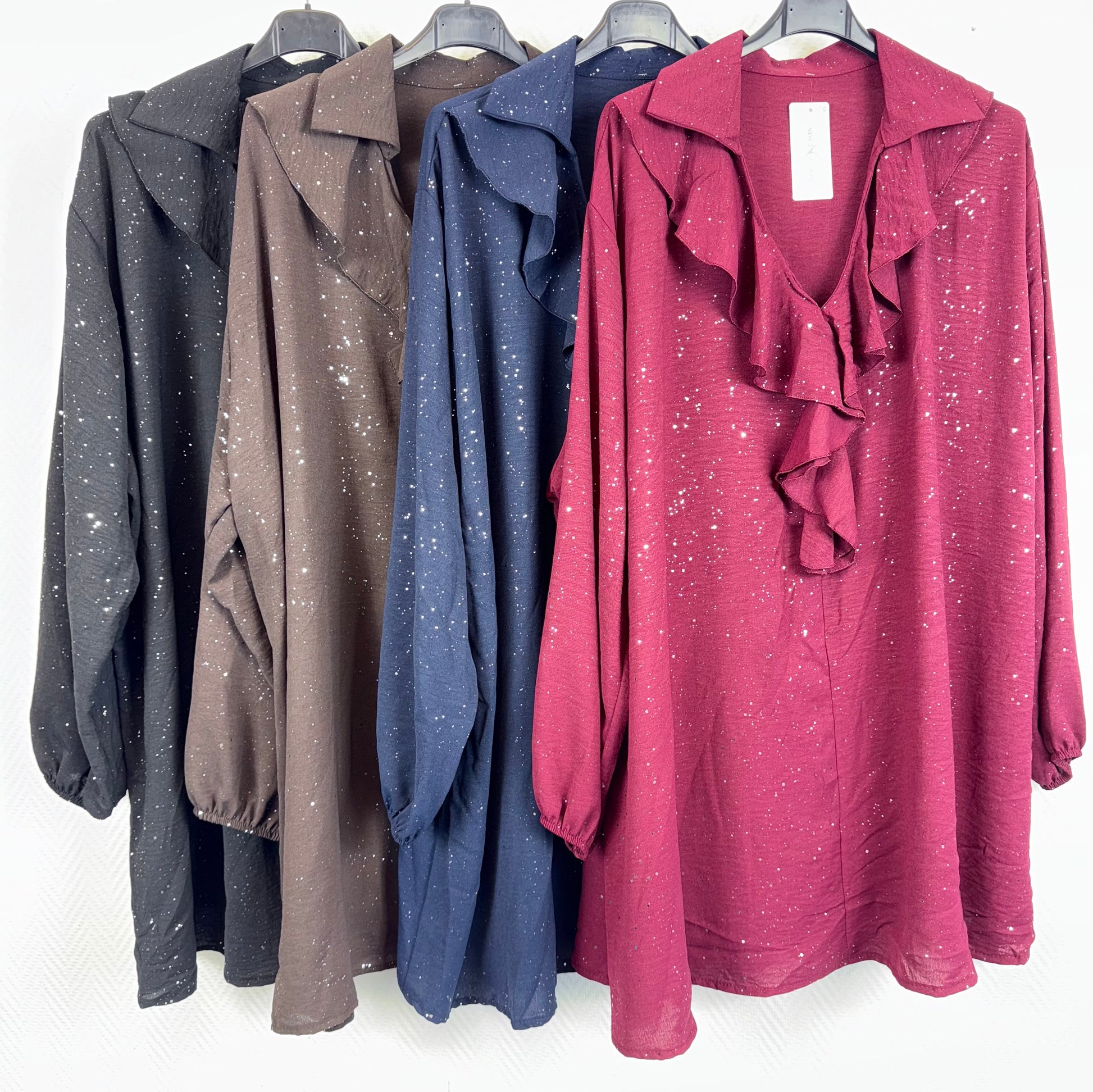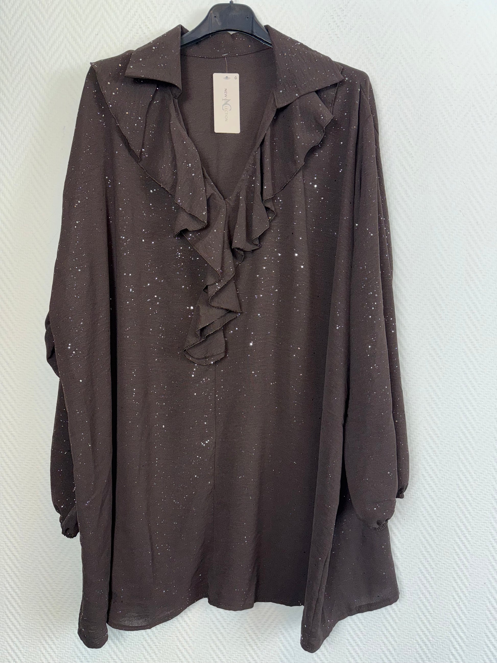 Mooie blouse/tuniek met leuke roezel en all over glitters.