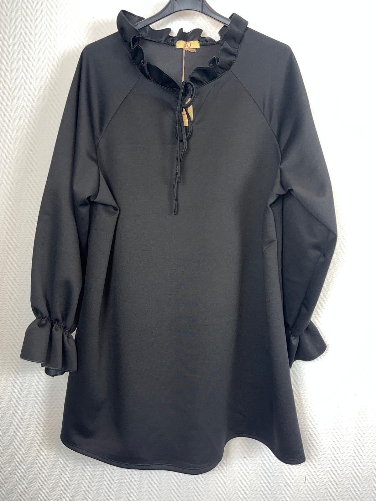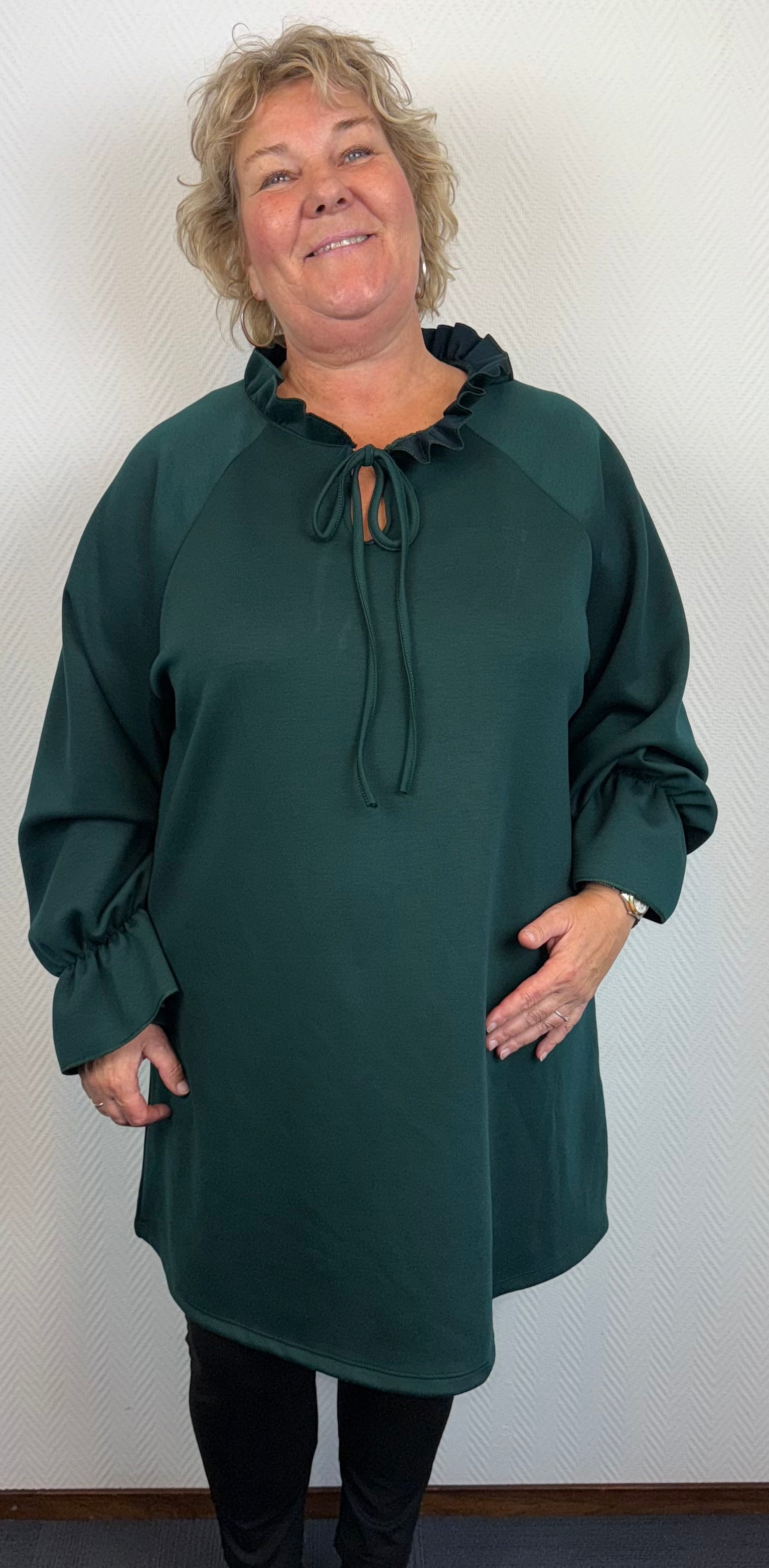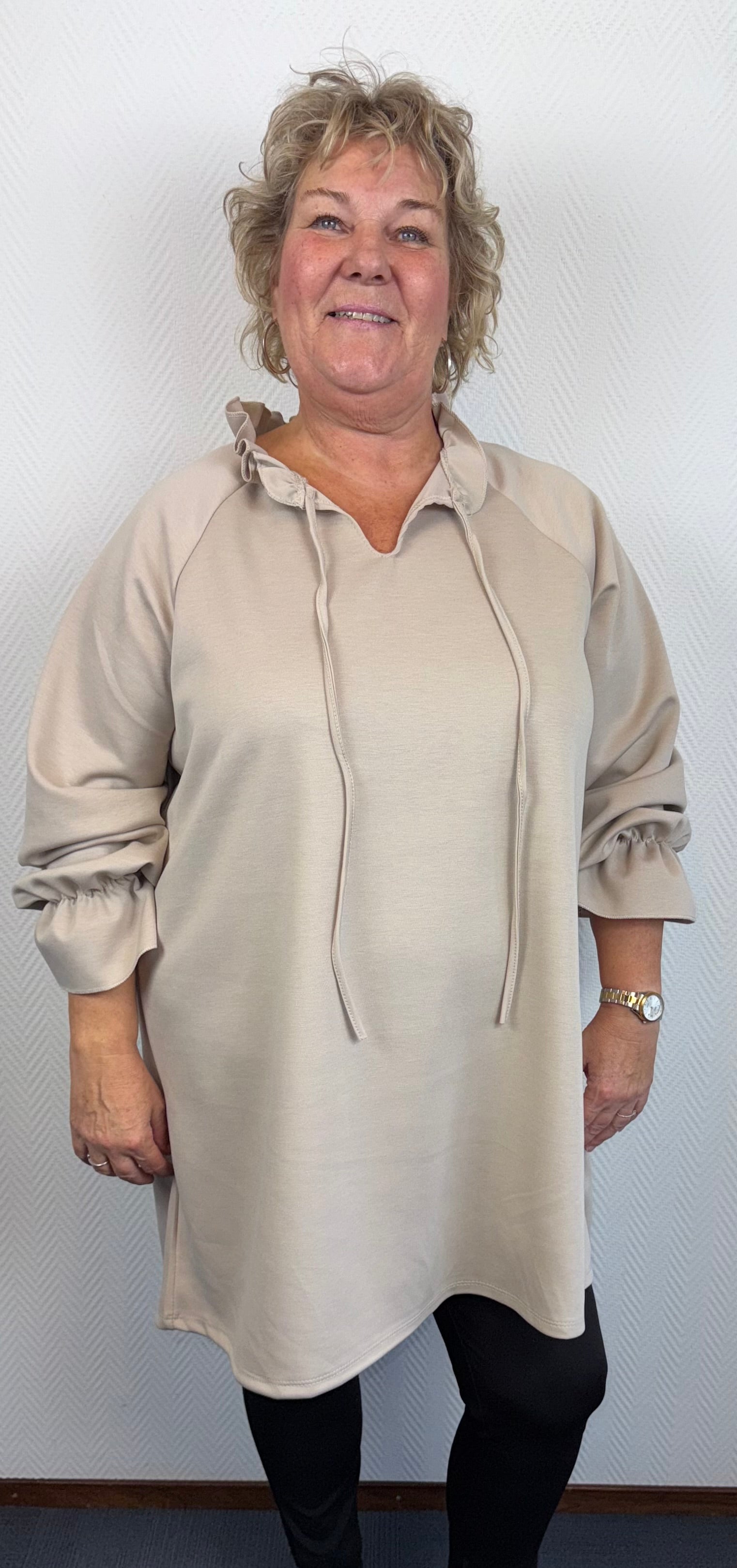 Wat een te gekke comfy trui in lichte A lijn met super leuke hals die je eventueel aan kunt trekken met het touwtje maar ook leuk om het touwtje los te laten hangen.
