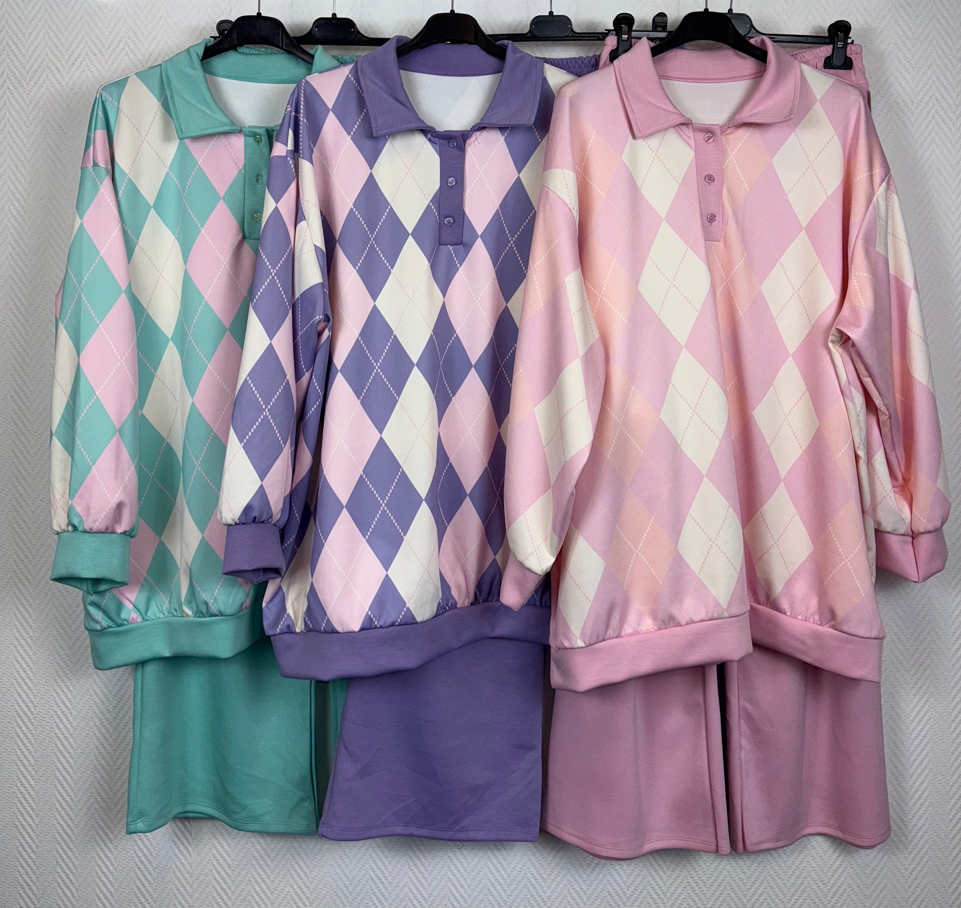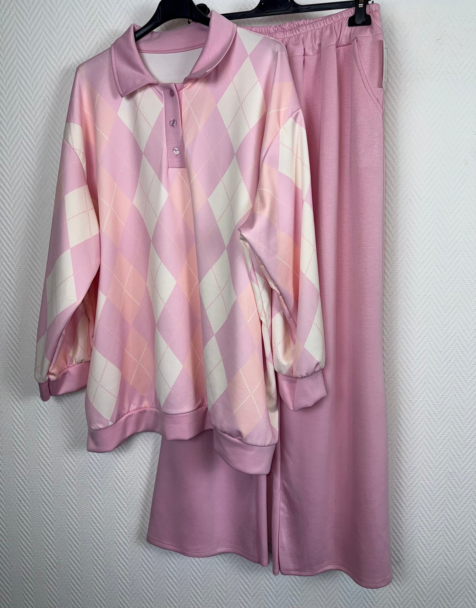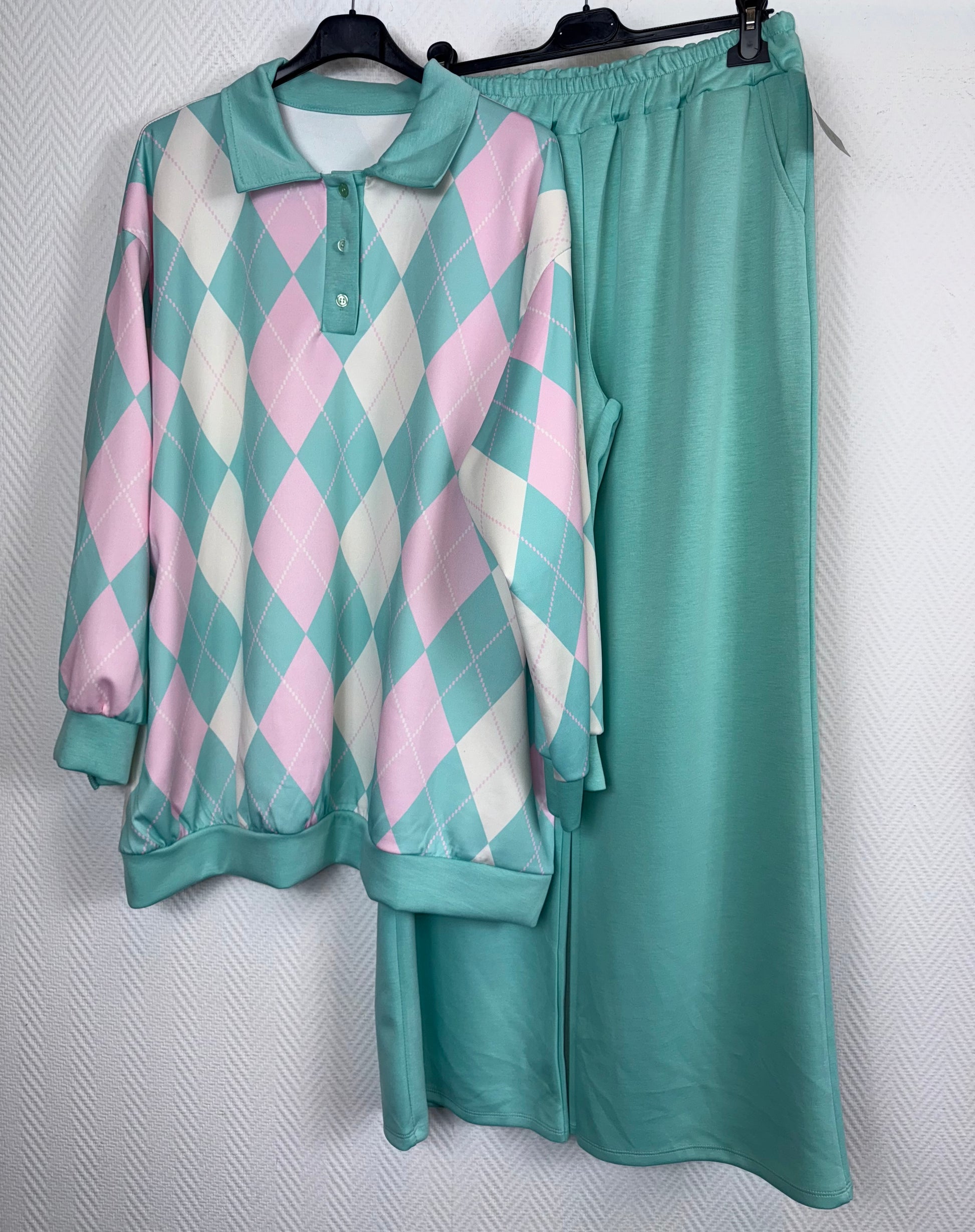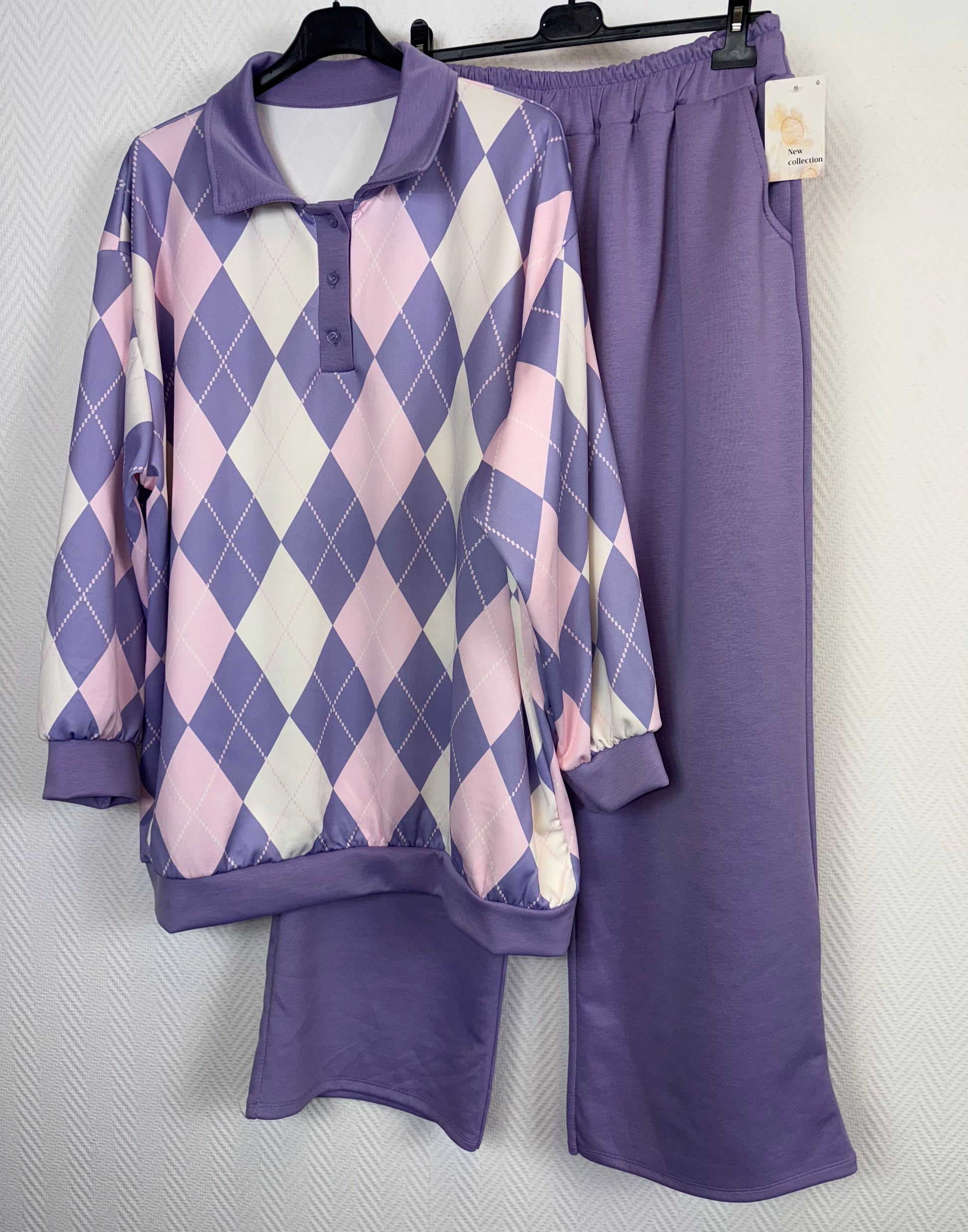 De trui is een polo model met kraagje en knoopjes en de broek is een hoog model met elastische taille, 2 steekzakken en recht/wijde pijpen.