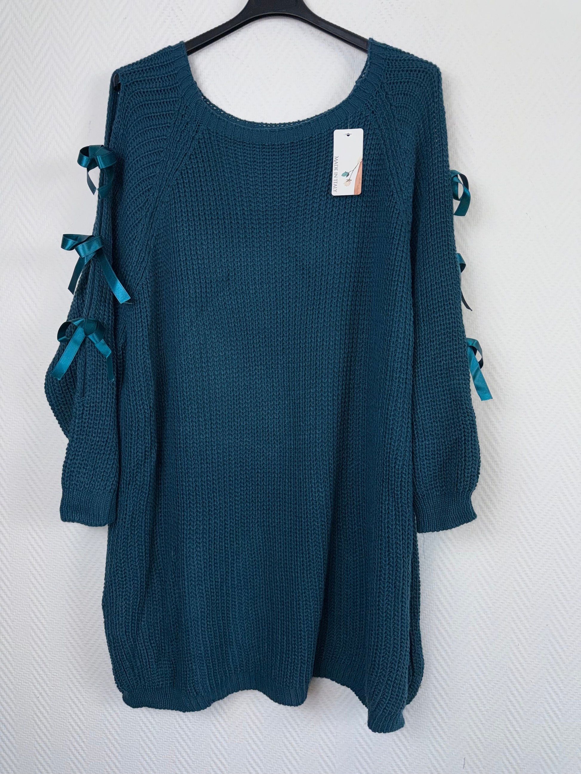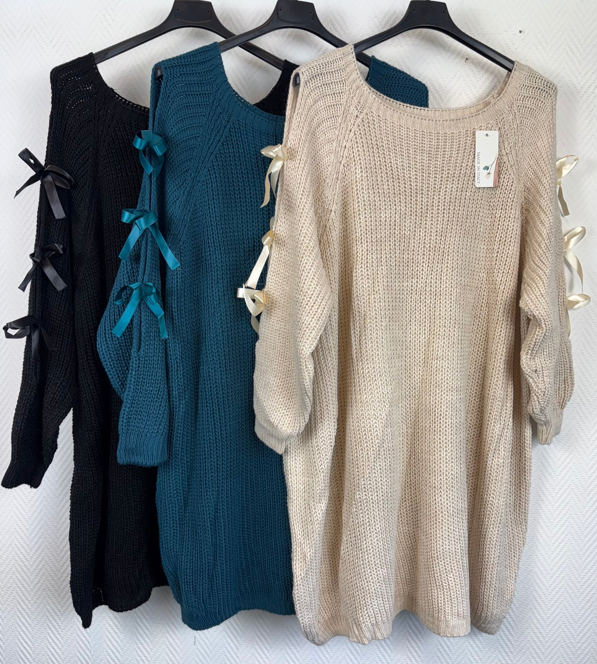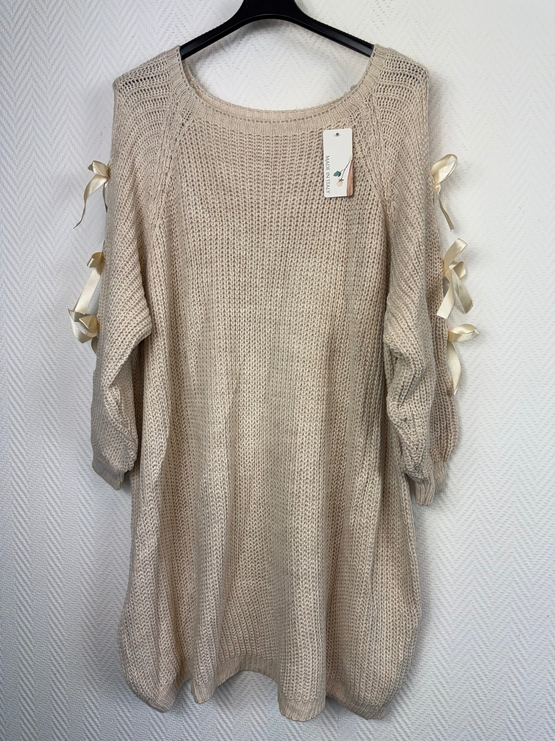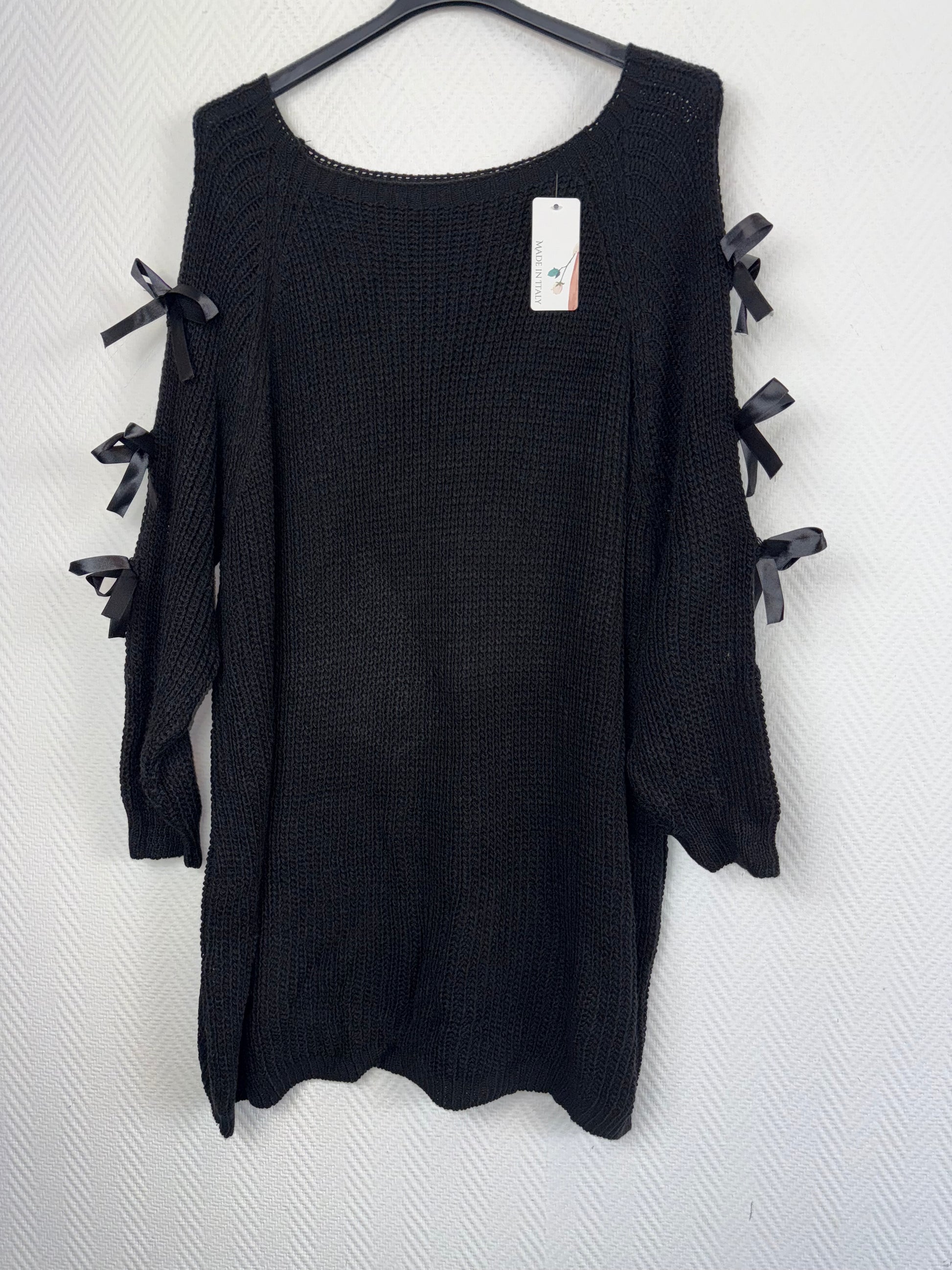 Leuke gebreide trui waarvan er bij de armen stukken open zijn en dan vastgemaakt zijn met strikjes 😍