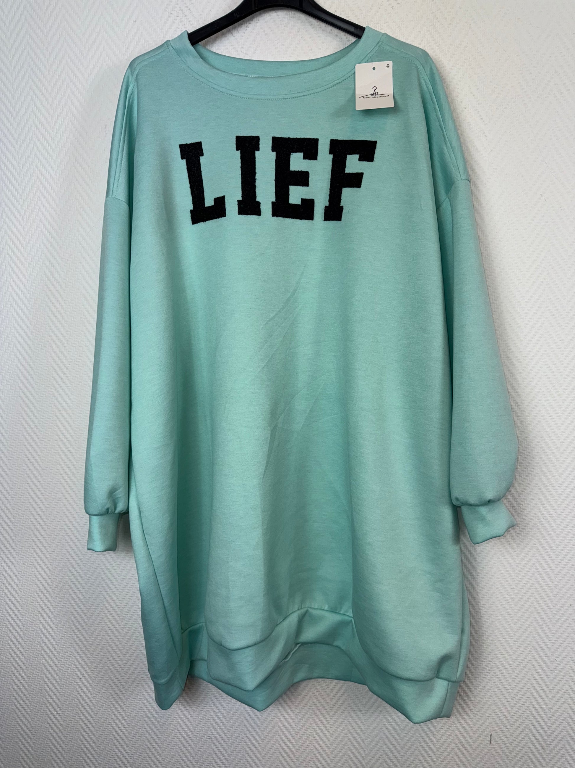 Super leuke sweatdress met voorop in teddy stof de tekst: Lief