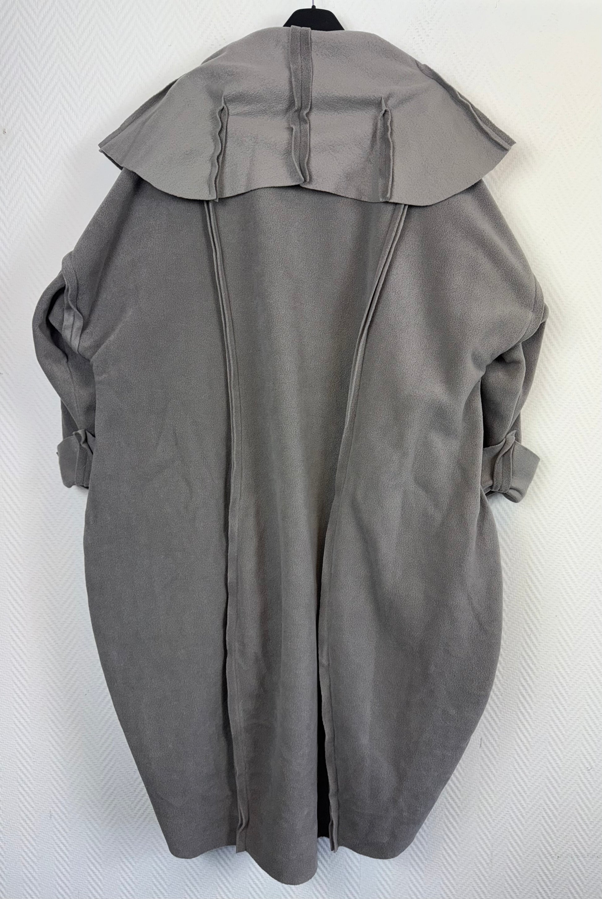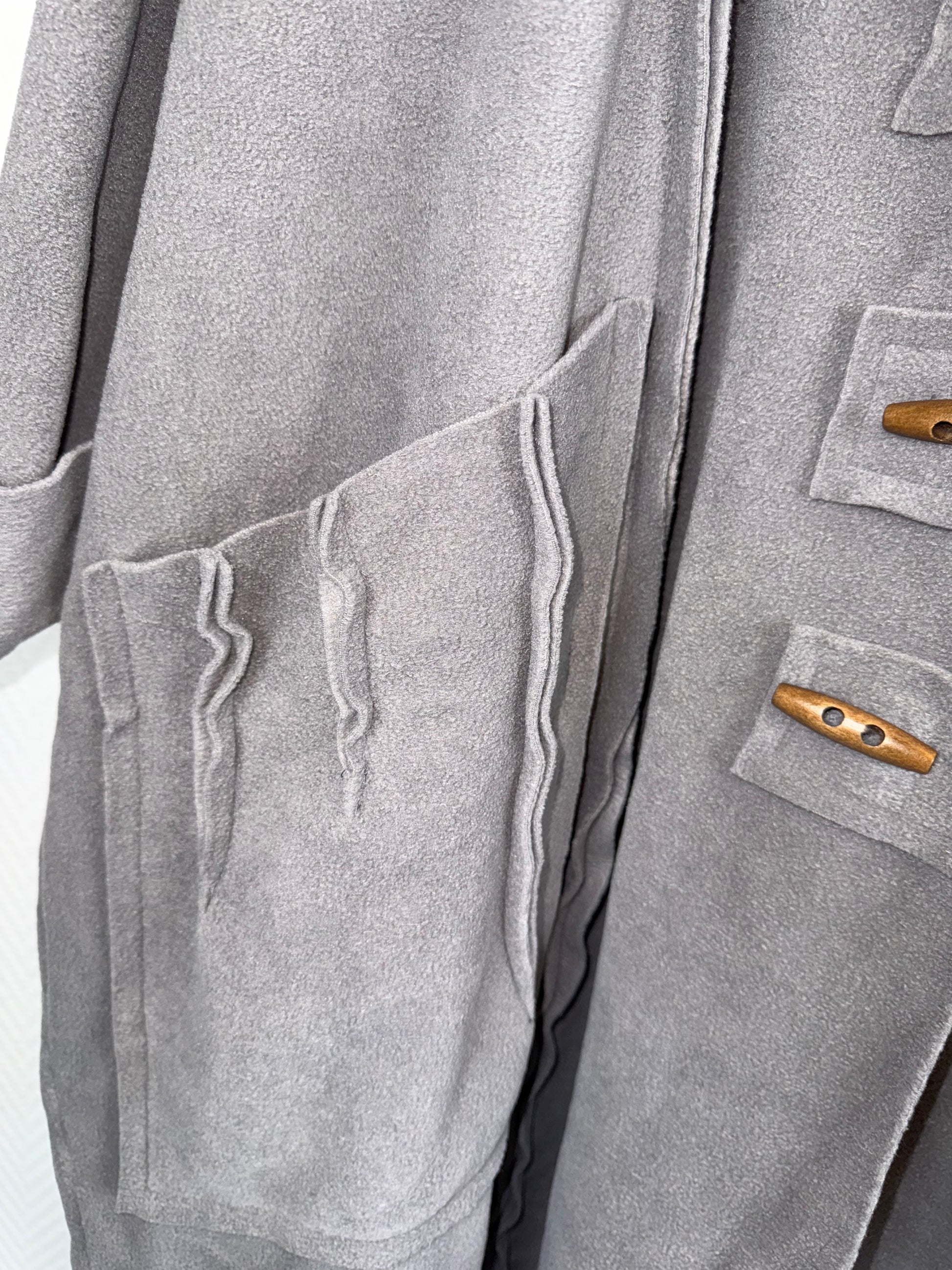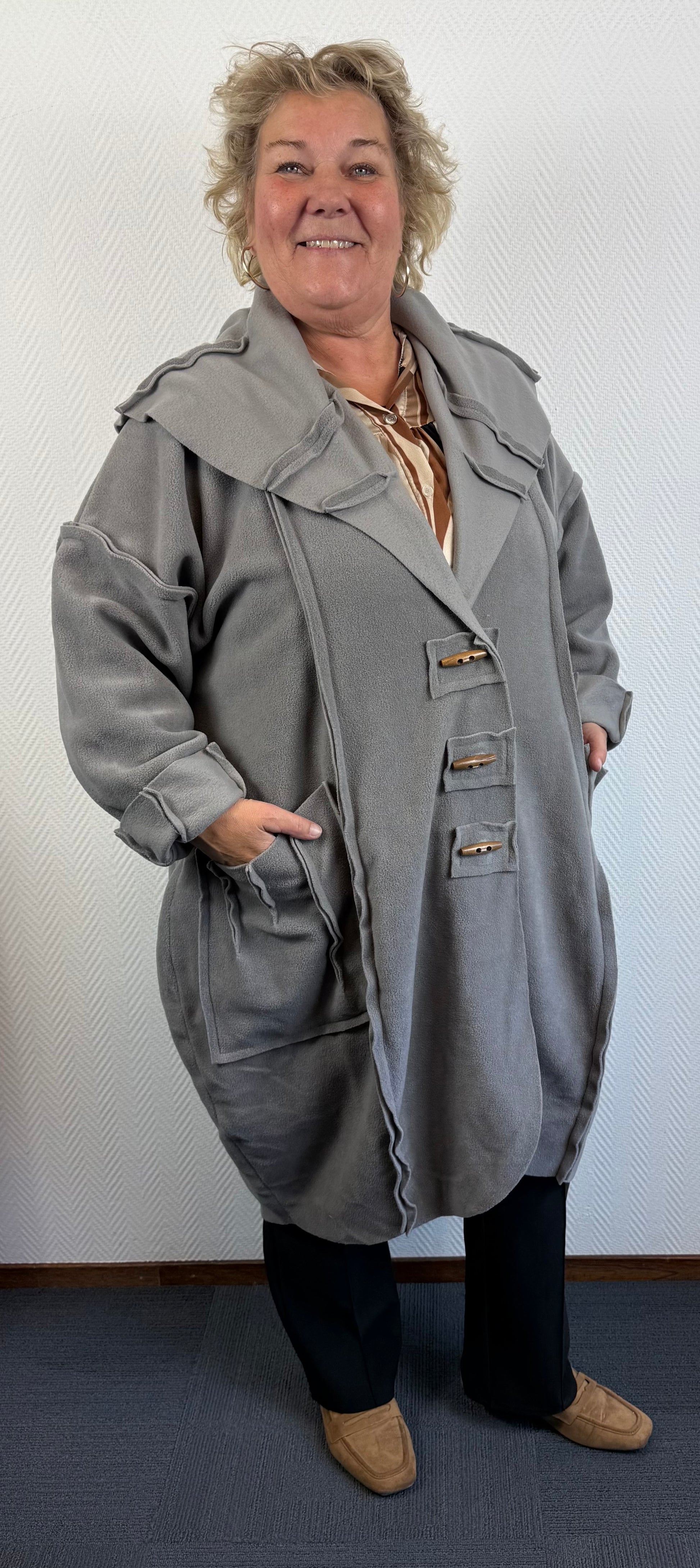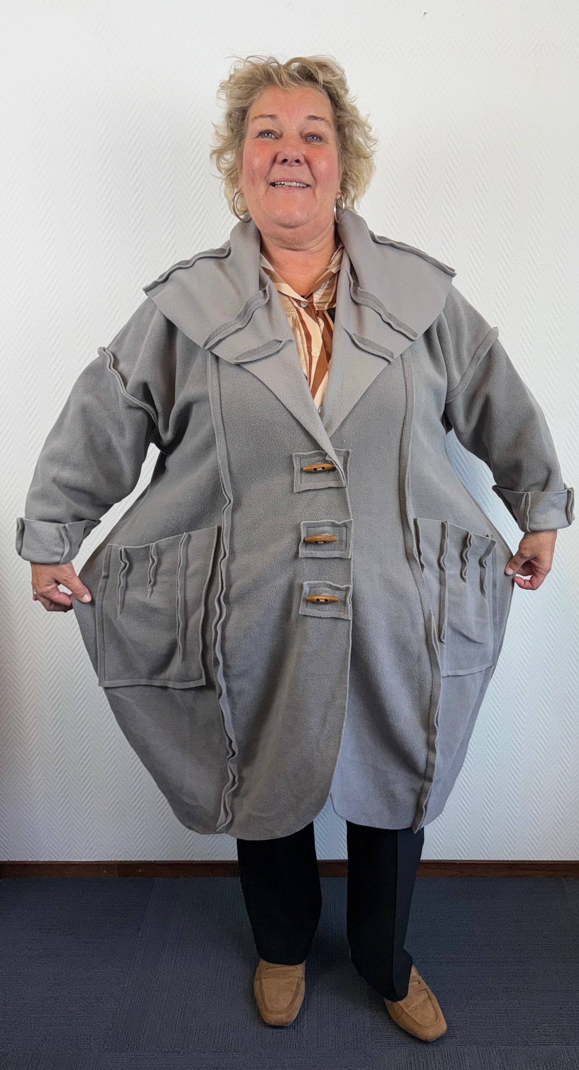 De capuchon die als een kraag op de rug ligt, de zakken, de houtje touwtje sluiting en ga zo maar door