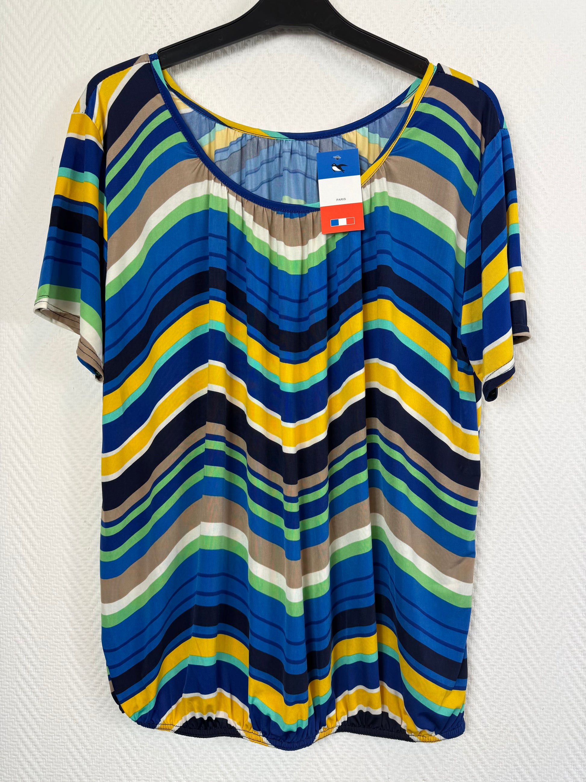 Ballontop in dat fijne travelstof en in te gek printje in blauw/geel/wit