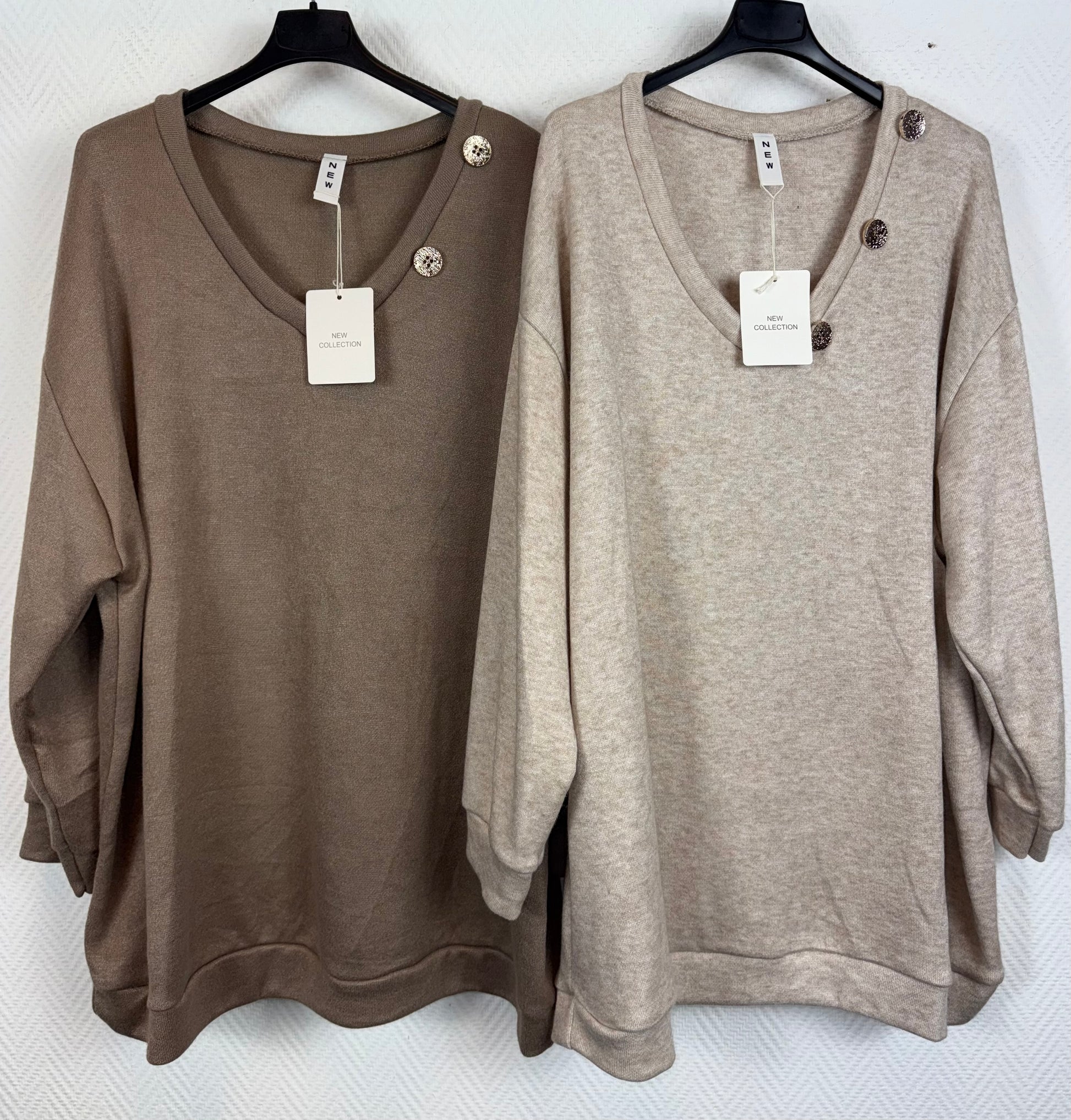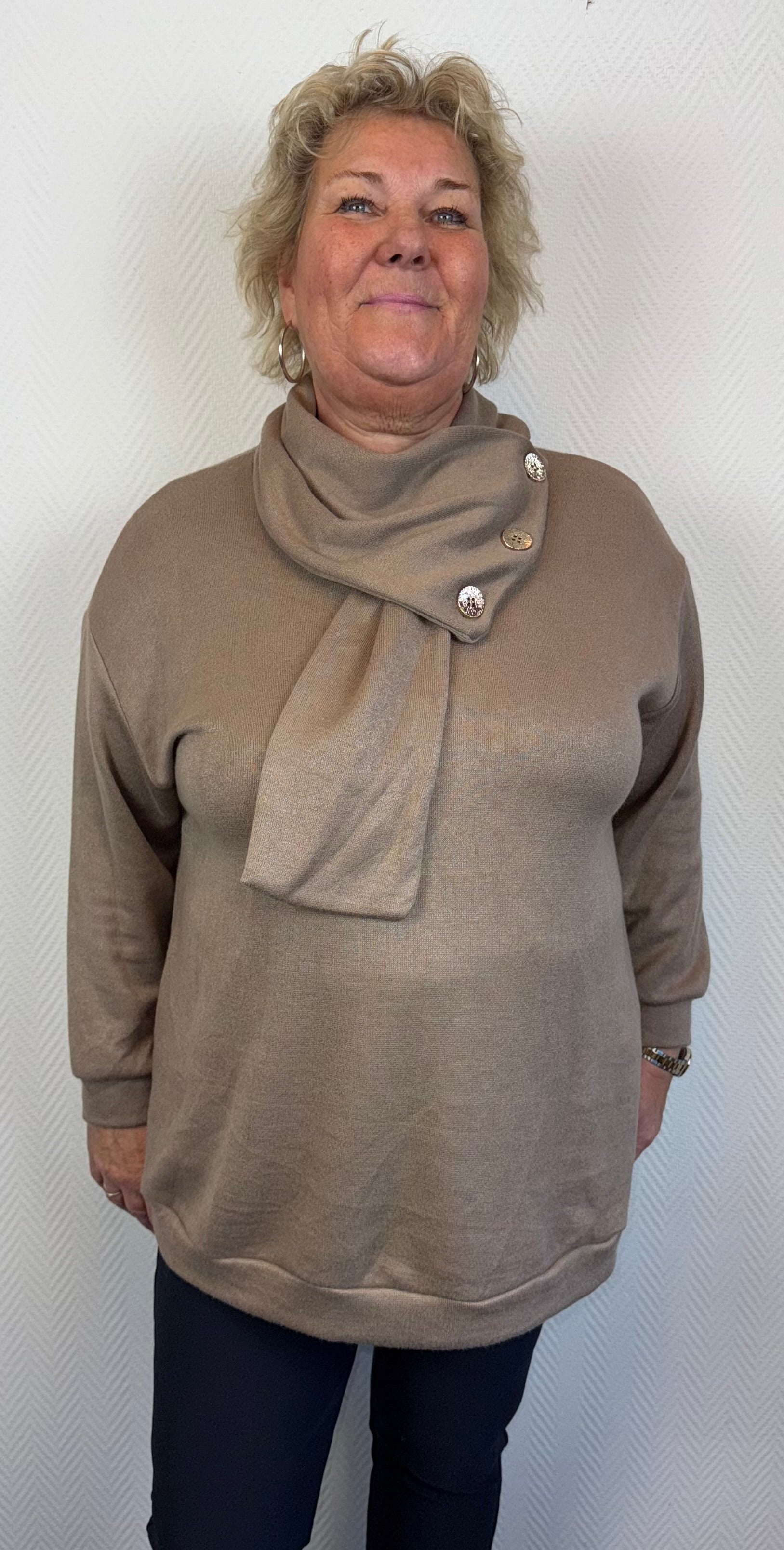Wat een plaatje van een trui die je op 2 manieren kunt dragen want het sjaaltje zit met 3 goudkleurige knopen vast maar die kun je dus ook losmaken en dan heb je een mooie trui met V hals en 3 goudkleurige knopen.